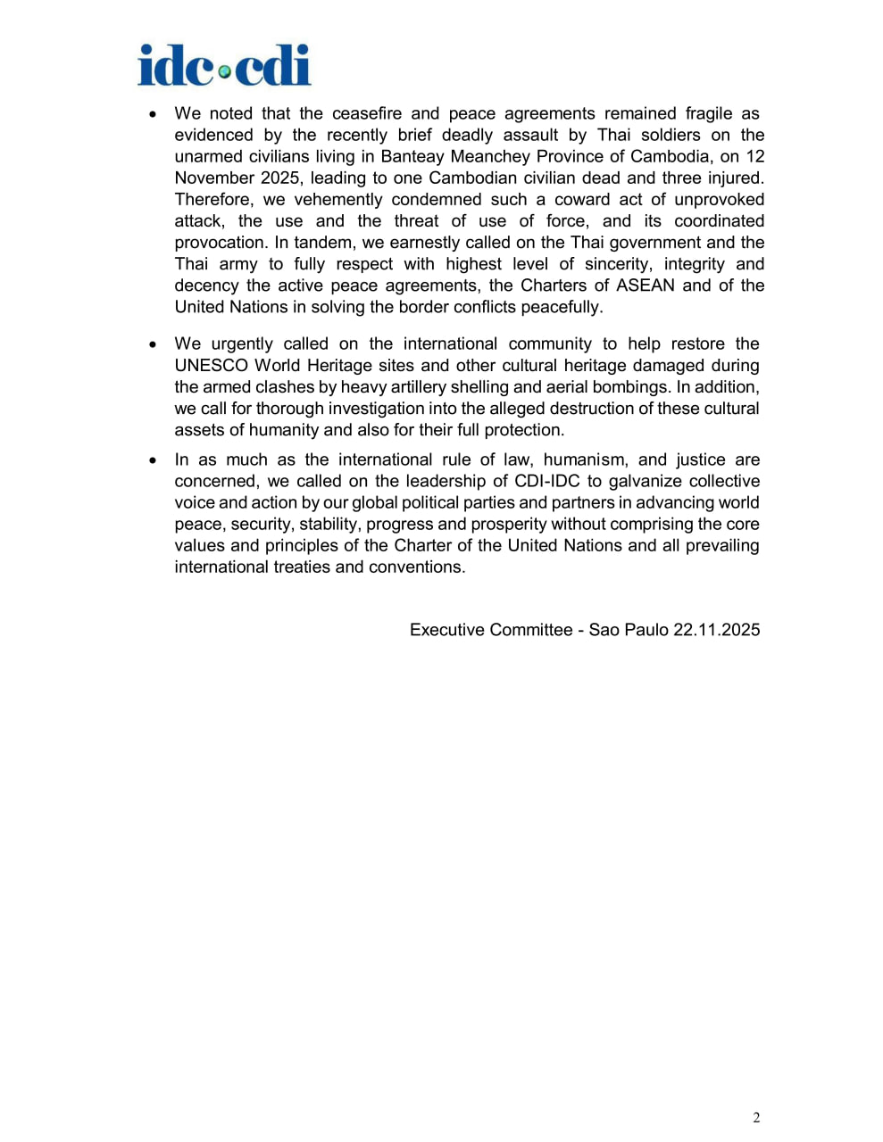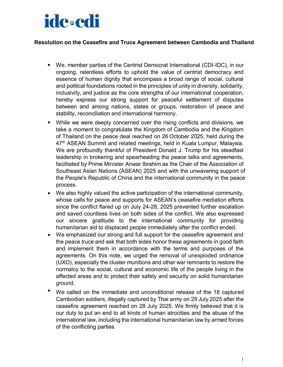 CDI-IDC Issues A Statement Over Resolution on the Ceasefire and Truce Agreement between Cambodia and Thailand