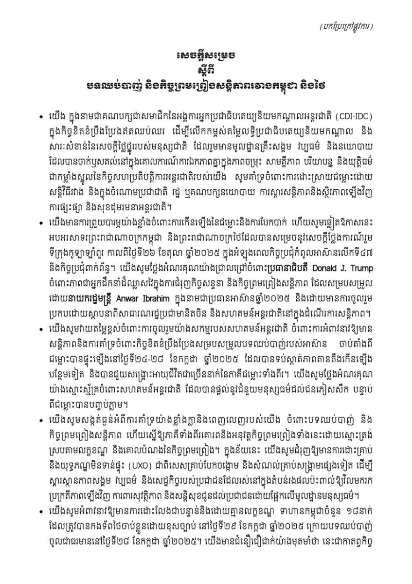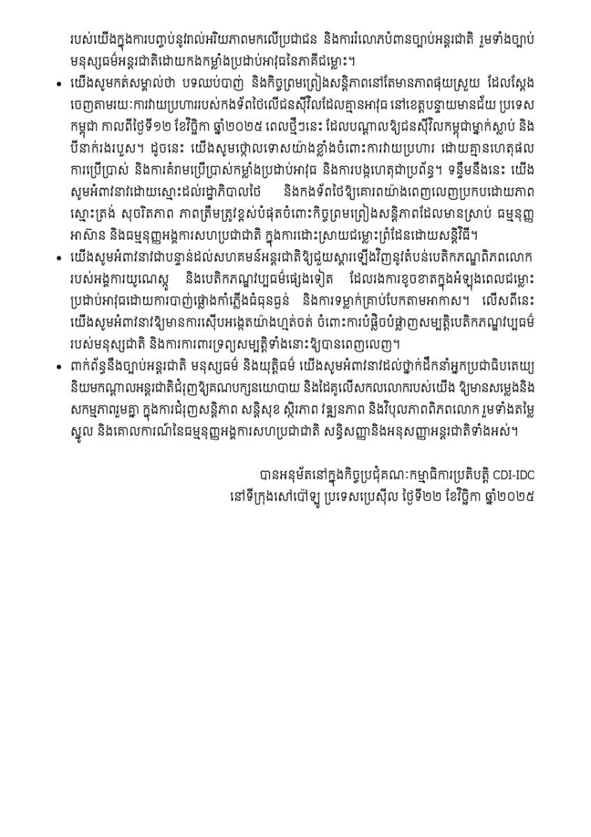 ជាមួយគ្នានោះដែរ CDI-IDC ក៏បានកត់សម្គាល់ផងដែរថា បទឈប់បាញ់ និងកិច្ចព្រមព្រៀងសន្តិ ភាពនៅតែមានភាពផុយស្រួយ ដែលស្តែងចេញតាមរយៈការវាយប្រហារបស់កងទ័ពថៃលើជនស៊ីវិលដែល គ្មានអាវុធ នៅខេត្តបន្ទាយមានជ័យ ប្រទេសកម្ពុជាកាលពីថ្ងៃទី១២ ខែវិច្ឆិកា ឆ្នាំ២០២៥ពេលថ្មីៗនេះ ដែល បណ្តាលឲ្យជនស៊ីវិលកម្ពុជាម្នាក់ស្លាប់ និងបីនាក់រងរបួស។ ដូច្នេះCDI-IDC សូមថ្កោលទោសយ៉ាងខ្លាំងចំពោះ ការវាយប្រហារ ដោយគ្មានហេតុផល ការប្រើប្រាស់ និងការគំរាមប្រើប្រាស់កម្លាំងប្រដាប់អាវុធ និងការបង្ករ ហេតុជាប្រព័ន្ធ។