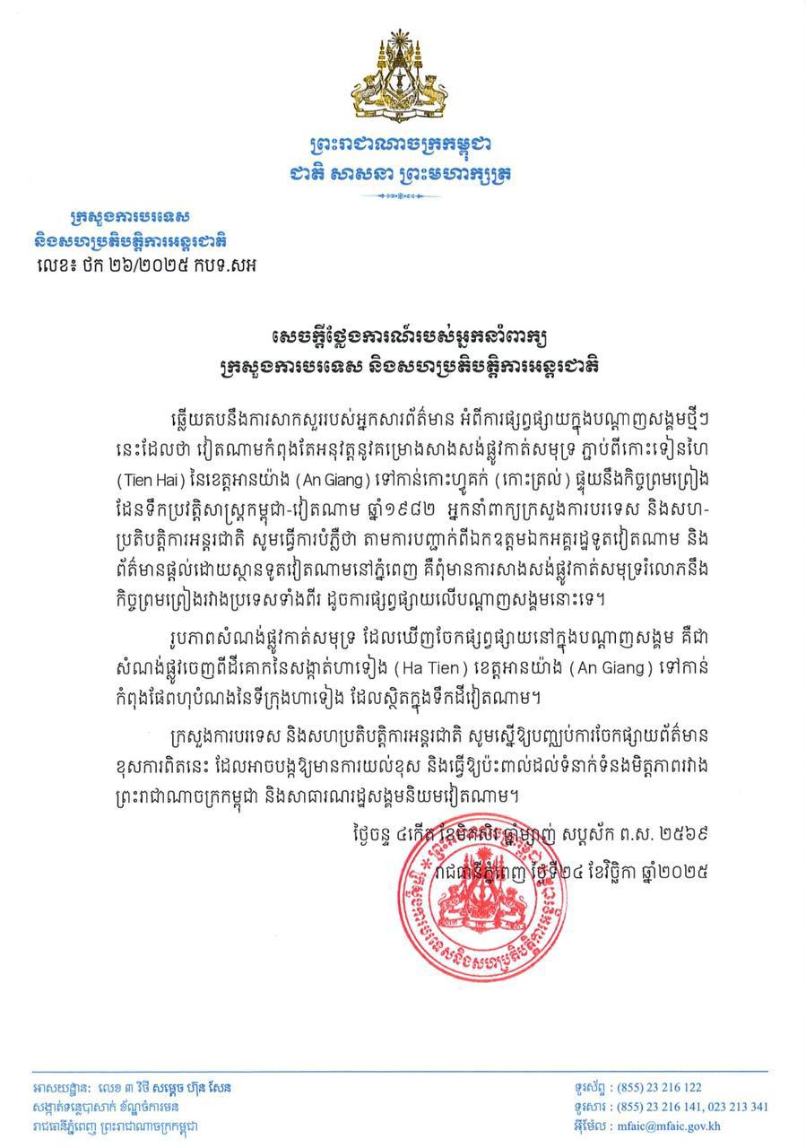 ឆ្លើយតបនឹងការសាកសួររបស់អ្នកសារព័ត៌មាន អំពីការផ្សព្វផ្សាយក្នុងបណ្តាញសង្គមថ្មីៗ នេះដែលថា វៀតណាមកំពុងតែអនុវត្តនូវគម្រោងសាងសង់ផ្លូវកាត់សមុទ្រ ភ្ជាប់ពីកោះទៀនហៃ (Tien Hai) នៃខេត្តអានយ៉ាង (An Giang) ទៅកាន់កោះហ្វូគក់ (កោះត្រល់) ផ្ទុយនឹងកិច្ចព្រមព្រៀងដែនទឹកប្រវត្តិសាស្ត្រកម្ពុជា-វៀតណាម ឆ្នាំ១៩៨២, អ្នកនាំពាក្យក្រសួងការបរទេស និងសហប្រតិបត្តិការអន្តរជាតិ បានធ្វើការបំភ្លឺថា តាមការបញ្ជាក់ពីលោកឯកអគ្គរដ្ឋទូតវៀតណាម និងព័ត៌មានផ្តល់ដោយស្ថានទូតវៀតណាមនៅភ្នំពេញ គឺពុំមានការសាងសង់ផ្លូវកាត់សមុទ្ររំលោភ នឹងកិច្ចព្រមព្រៀងរវាងប្រទេសទាំងពីរ ដូចការផ្សព្វផ្សាយលើបណ្តាញសង្គមនោះទេ។