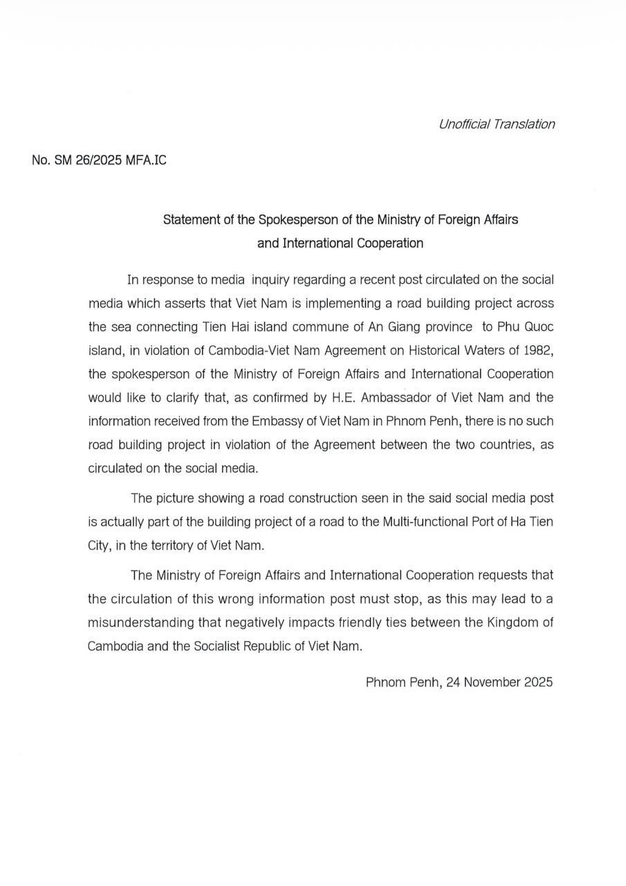ក្រសួងការបរទេស និងសហប្រតិបត្តិការអន្តរជាតិ នៅថ្ងៃទី២៤ ខែវិច្ឆិកា ឆ្នាំ២០២៥នេះ បានចេញសេចក្ដីថ្លែងការណ៍អំពីការផ្សព្វផ្សាយ ក្នុងបណ្តាញសង្គមថ្មីៗនេះ អំពីវៀតណាមកំពុងតែអនុវត្តនូវគម្រោងសាងសង់ផ្លូវកាត់សមុទ្រ។