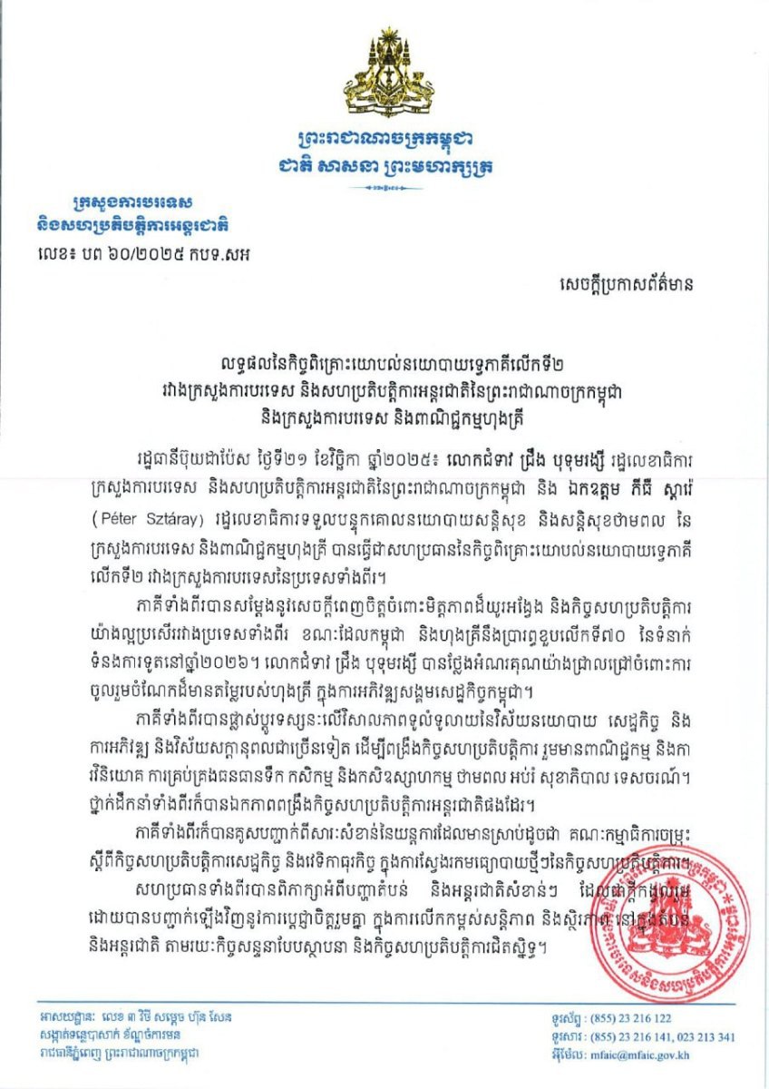 លោកជំទាវ ជឹង បុទុមរង្សី រដ្ឋលេខាធិការ ក្រសួងការបរទេស និងសហប្រតិបត្តិការអន្តរជាតិនៃព្រះរាជាណាចក្រកម្ពុជា និង ឯកឧត្តម ភីធឺ ស្តារ៉ (Péter Sztáray) រដ្ឋលេខាធិការទទួលបន្ទុកគោលនយោបាយសន្តិសុខ និងសន្តិសុខថាមពល ន ក្រសួងការបរទេស និងពាណិជ្ជកម្មហុងគ្រី បានធ្វើជាសហប្រធាននៃកិច្ចពិគ្រោះយោបល់នយោបាយទ្វេភាគី លើកទី២ រវាងក្រសួងការបរទេសនៃប្រទេសទាំងពីរ។