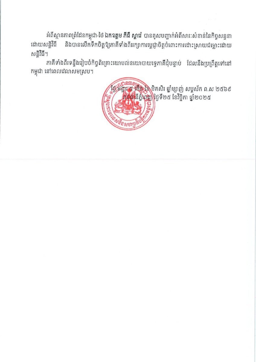 ភាគីទាំងពីរបានផ្លាស់ប្តូរទស្សនៈលើវិសាលភាពទូលំទូលាយនៃវិស័យនយោបាយ សេដ្ឋកិច្ច និង ការអភិវឌ្ឍ និងវិស័យសក្តានុពលជាច្រើនទៀត ដើម្បីពង្រឹងកិច្ចសហប្រតិបត្តិការ រួមមានពាណិជ្ជកម្ម និងកា រវិនិយោគ ការគ្រប់គ្រងធនធានទឹក កសិកម្ម និងកសិឧស្សាហកម្ម ថាមពល អប់រំ សុខាភិបាល ទេសចរណ៍។ ថ្នាក់ដឹកនាំទាំងពីរក៏បានឯកភាពពង្រឹងកិច្ចសហប្រតិបត្តិការអន្តរជាតិផងដែរ។