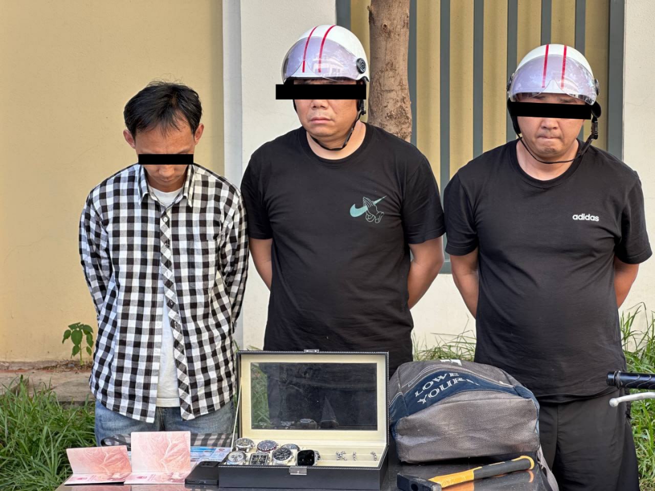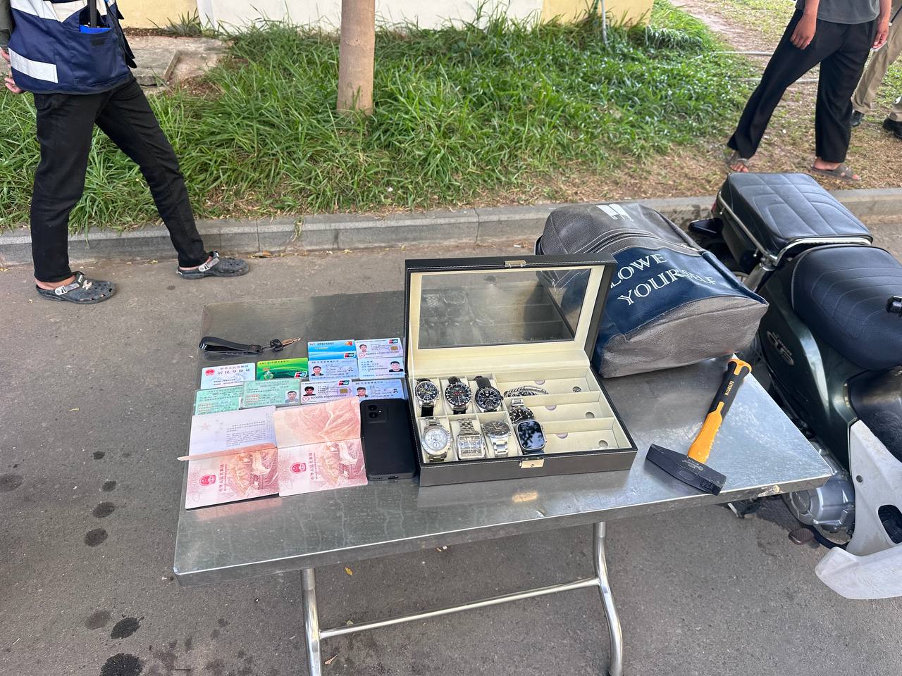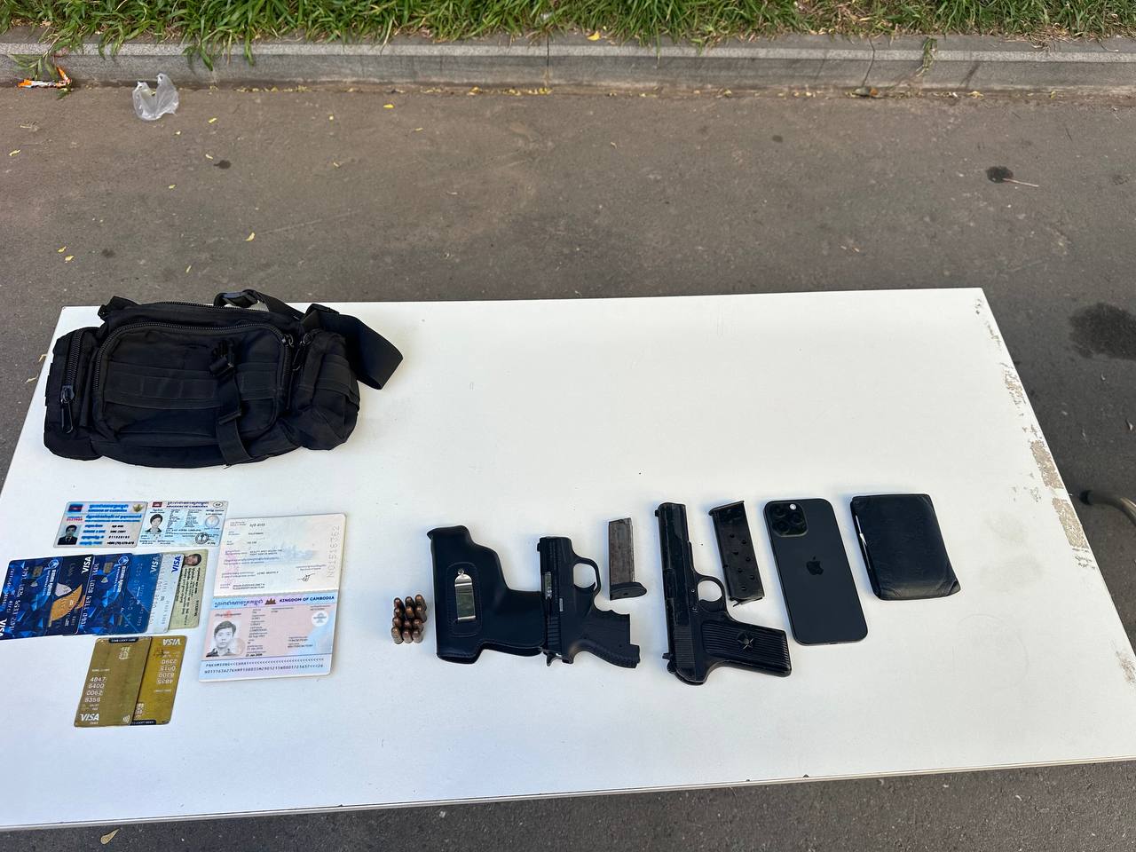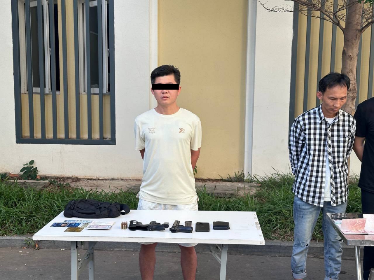 ក្នុងនោះដកហូតវត្ថុតាងបានរួមមាន អាវុធខ្លីម៉ាក K ៥៤ លេខ៧៤៨១ ចំនួន ៨គ្រាប់ , អាវុធខ្លីម៉ាក zaraki M906 ចំនួន ៤គ្រាប់ , នាឡិការដៃ ចំនួន គ្រឿង (របស់ជនរងគ្រោះ) , ខ្សែក៎ ពណ៌ទឹកប្រាក់ចំនួន២ខ្សែ (របស់ជនរងគ្រោះ) , ខ្សែដៃពណ៌ទឹកប្រាក់ចំនួន២ខ្សែ(របស់ជនរងគ្រោះ) , ប៉ាស្ទ័រចំនួន ២ក្បាល , ម៉ូតូ Honda Custom ស្លាកលេខភ្នំពេញ1-HN-1587 ពណ៌ស្លែរចំនួន01គ្រឿង(ជាម៉ូតូធ្វើសកម្មភាព) , ទូរស័ព្ទ ម៉ាក Honor ពណ៌ខ្មៅ ០១គ្រឿង , ញញួរ ពណ៌លឿងលាយខ្មៅចំនួន ០១ (សម្រាប់ធ្វើសកម្មភាពវាយកញ្ចក់ផ្ទះ) , កាបូបស្ពាយ ពណ៌ប្រផេះ ចំនួន០១ , មួកខ្មៅ ០១ និងមួកសុវត្ថិភាព ពណ៌ស ចំនួន០២ ។