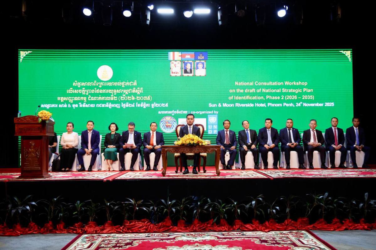 ឯកឧត្តមអភិសន្តិបណ្ឌិត ស សុខា ឧបនាយករដ្ឋមន្ត្រី រដ្ឋមន្ត្រីក្រសួងមហាផ្ទៃ និងជាប្រធានគណៈកម្មាធិការជាតិ ដឹកនាំតម្រង់ទិសការងារអត្រានុកូលដ្ឋាន ស្ថិតិអត្រានុកូលដ្ឋាន និងអត្តសញ្ញាណកម្ម នៅរសៀលថ្ងៃទី២៤ ខែវិច្ឆិកា ឆ្នាំ២០២៥នេះ បានអញ្ជើញជាអធិបតីពិធីបិទសិក្ខាសាលាពិគ្រោះយោបល់ថ្នាក់ជាតិលើសេចក្តីព្រាងផែនការយុទ្ធសាស្ត្រជាតិ ស្តីពីអត្តសញ្ញាណកម្ម ដំណាក់កាលទី២ (២០២៦-២០៣៥)។