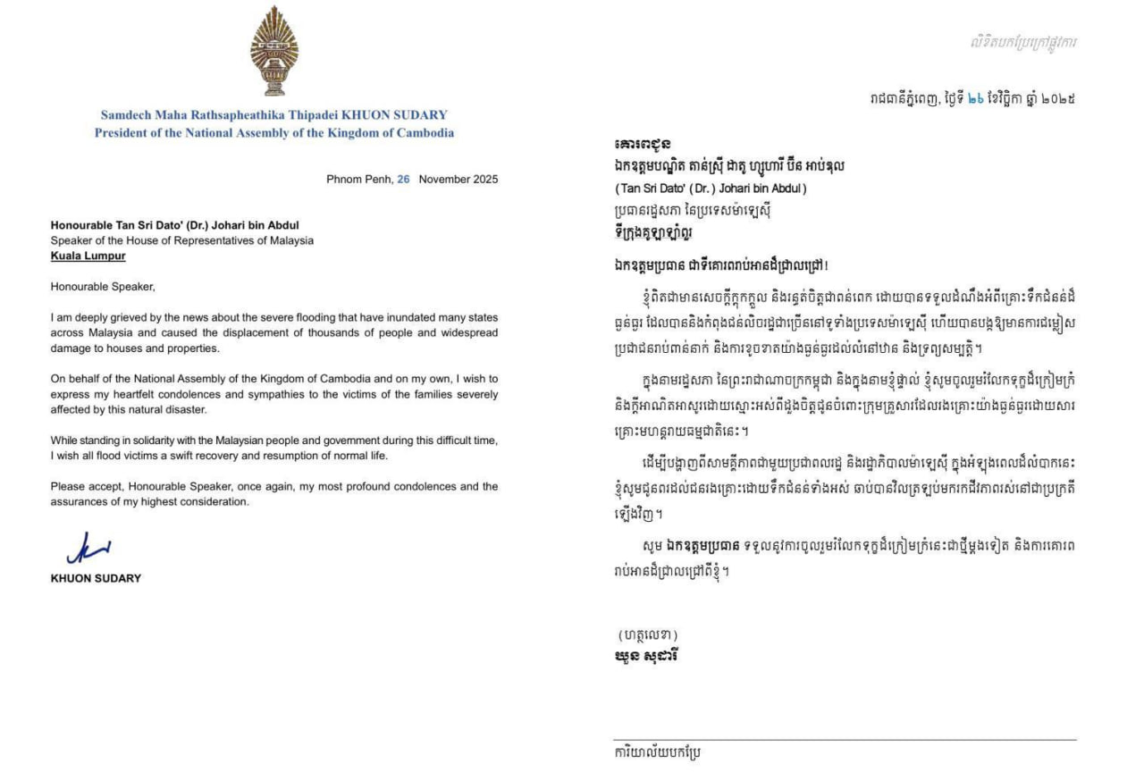 សម្តេចមហារដ្ឋសភាធិការធិបតី ឃួន សុដារី ប្រធានរដ្ឋសភា នៃព្រះរាជាណាចក្រកម្ពុជា ផ្ញេីសារលិខិតចូលរួមរំលែកទុក្ខដ៏ក្រៀមក្រំ និងក្តីអាណិតអាសូរដោយស្មោះអស់ពីដួងចិត្ត គោរពជូន ឯកឧត្តមបណ្ឌិត តាន់ស្រ៉ី ដាតូ ហ្សូហារី ប៊ីន អាប់ឌុល (Tan Sri Dato’ (Dr.) Johari bin Abdul) ប្រធានរដ្ឋសភា នៃប្រទេសម៉ាឡេស៊ី និងជូនចំពោះក្រុមគ្រួសារដែលរងគ្រោះទឹកជំនន់ដ៏ធ្ងន់ធ្ងរ ដែលបាននឹងកំពុងជន់លិចរដ្ឋជាច្រើននៅទូទាំងប្រទេសម៉ាឡេស៊ី ហើយបានបង្កឱ្យមានការជម្លៀស ប្រជាជនរាប់ពាន់នាក់ និងការខូចខាតយ៉ាងធ្ងន់ធ្ងរដល់លំនៅឋាន និងទ្រព្យសម្បត្តិ។