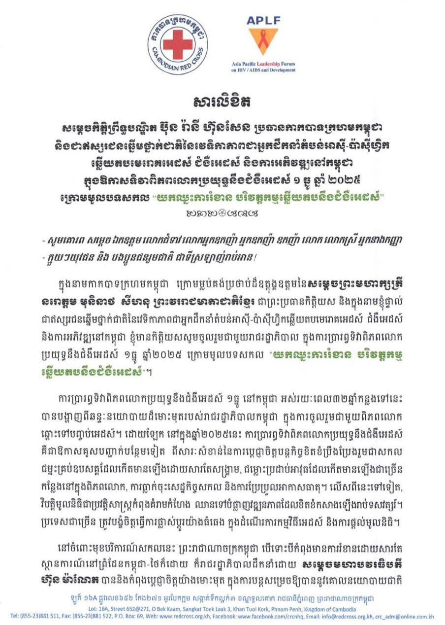 ភ្នំពេញ៖ សម្ដេចកិត្តិព្រឹទ្ធបណ្ឌិត ប៊ុន រ៉ានី ហ៊ុនសែន ប្រធានកាកបាទក្រហមកម្ពុជា និងជាឥស្សរជនឆ្នើមថ្នាក់ជាតិ នៃវេទិកាភាពជាអ្នកដឹកនាំតំបន់អាស៊ី-ប៉ាស៊ីហ្វិក ឆ្លើយតបមេរោគអេដស៍ ជំងឺអេដស៍ និងការអភិវឌ្ឍនៅកម្ពុជា ផ្ញើសារលិខិតជូនជនរួមជាតិក្នុងឱកាសទិវាពិភពលោកប្រយុទ្ធនឹងជំងឺអេដស៍ ១ ធ្នូ ២០២៥ ក្រោមមូលបទសកល «យកឈ្នះការរំខាន បរិវត្តកម្មឆ្លើយតបមេរោគអេដស៍»៕