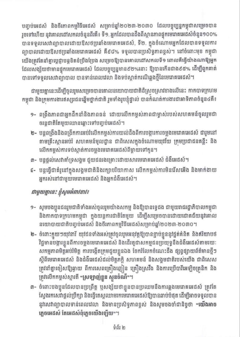 សម្ដេចកិត្តិព្រឹទ្ធបណ្ឌិត ប៊ុន រ៉ានី ហ៊ុនសែន ផ្ញើសារលិខិតជូនជនរួមជាតិក្នុងឱកាសទិវាពិភពលោកប្រយុទ្ធនឹងជំងឺអេដស៍ ១ ធ្នូ ២០២៥ ក្រោមមូលបទសកល «យកឈ្នះការរំខាន បរិវត្តកម្មឆ្លើយតបមេរោគអេដស៍»
