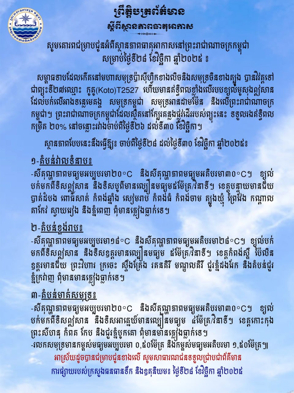 ក្រសួងធនធានទឹក ជូនដំណឹងអំពីស្ថានភាពធាតុអាកាសនៅកម្ពុជា សម្រាប់ថ្ងៃទី២៨ ខែវិច្ឆិកា ឆ្នាំ២០២៥