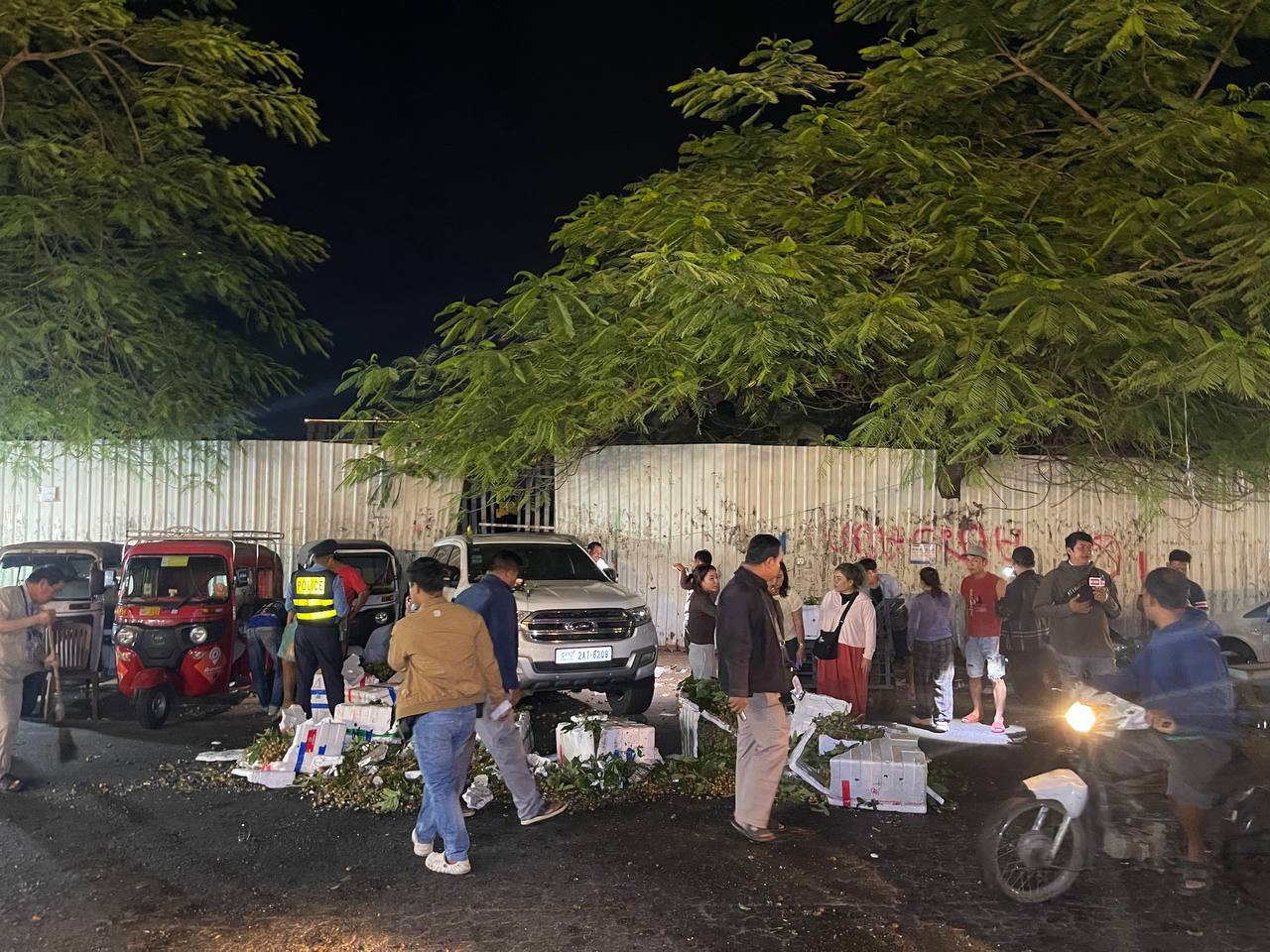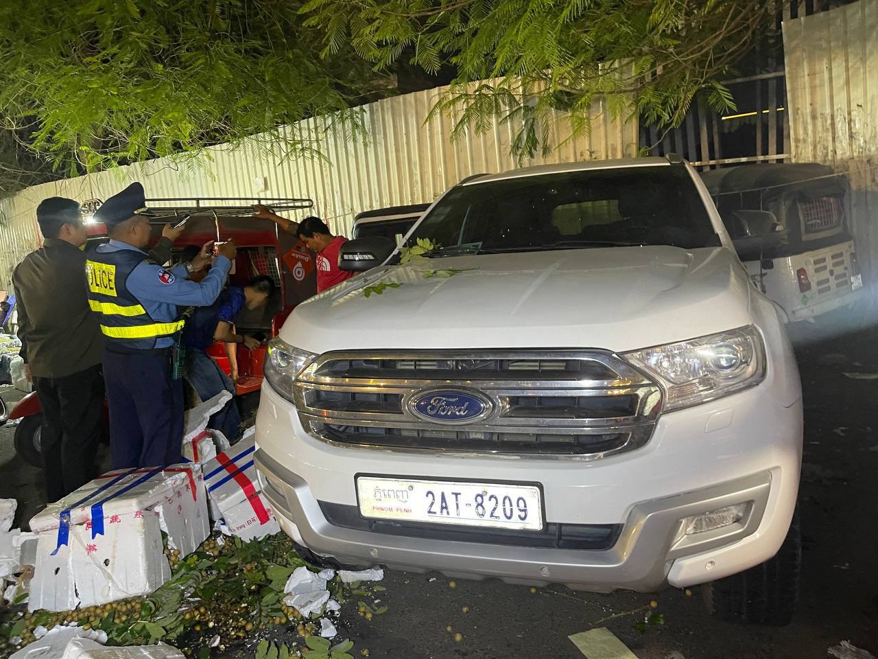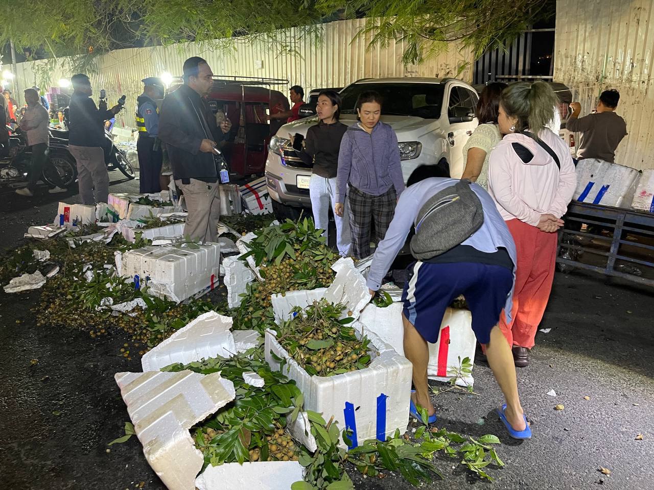 ភ្នំពេញ៖ បុរសម្នាក់បានបើករថយន្តម៉ាក fordមួយគ្រឿង បើករយ៉ែថយក្រោយចេញពីក្នុងKTVមួយកន្លែងបណ្តាលឲ្យជ្រុលទៅបុករះម៉ូតូរុឺម៉ករួមទាំងមានសម្ភារះផ្លែឈើមួយចំនួនធំ បង្កឲ្យមានការភ្ញាក់ផ្អើលកាលពី យប់ ថ្ងៃទី២៧ខែវិច្ឆិកា ឆ្នាំ២០២៥ ចំណុចផ្សារនាគមាសស្ថិតនៅលើផ្លូវ២៣០ សង្កាត់ផ្សារដើមគ ខណ្ឌទួលគោក រាជធានីភ្នំពេញ។