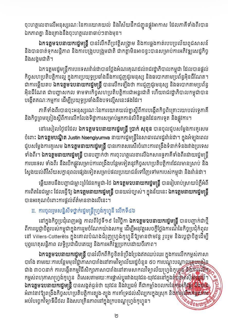 លទ្ធផលនៃការអញ្ជើញចូលរួមរបស់ ឯកឧត្តមឧបនាយករដ្ឋមន្ត្រី ប្រាក់ សុខុន នៅក្នុងសន្និសីទថ្នាក់រដ្ឋមន្ត្រីហ្វ្រង់កូហ្វូនីលើកទី៤៦ និងជំនួបទ្វេភាគី នៅទីក្រុងគីហ្គាលី នៃសាធារណរដ្ឋរវ៉ាន់ដា