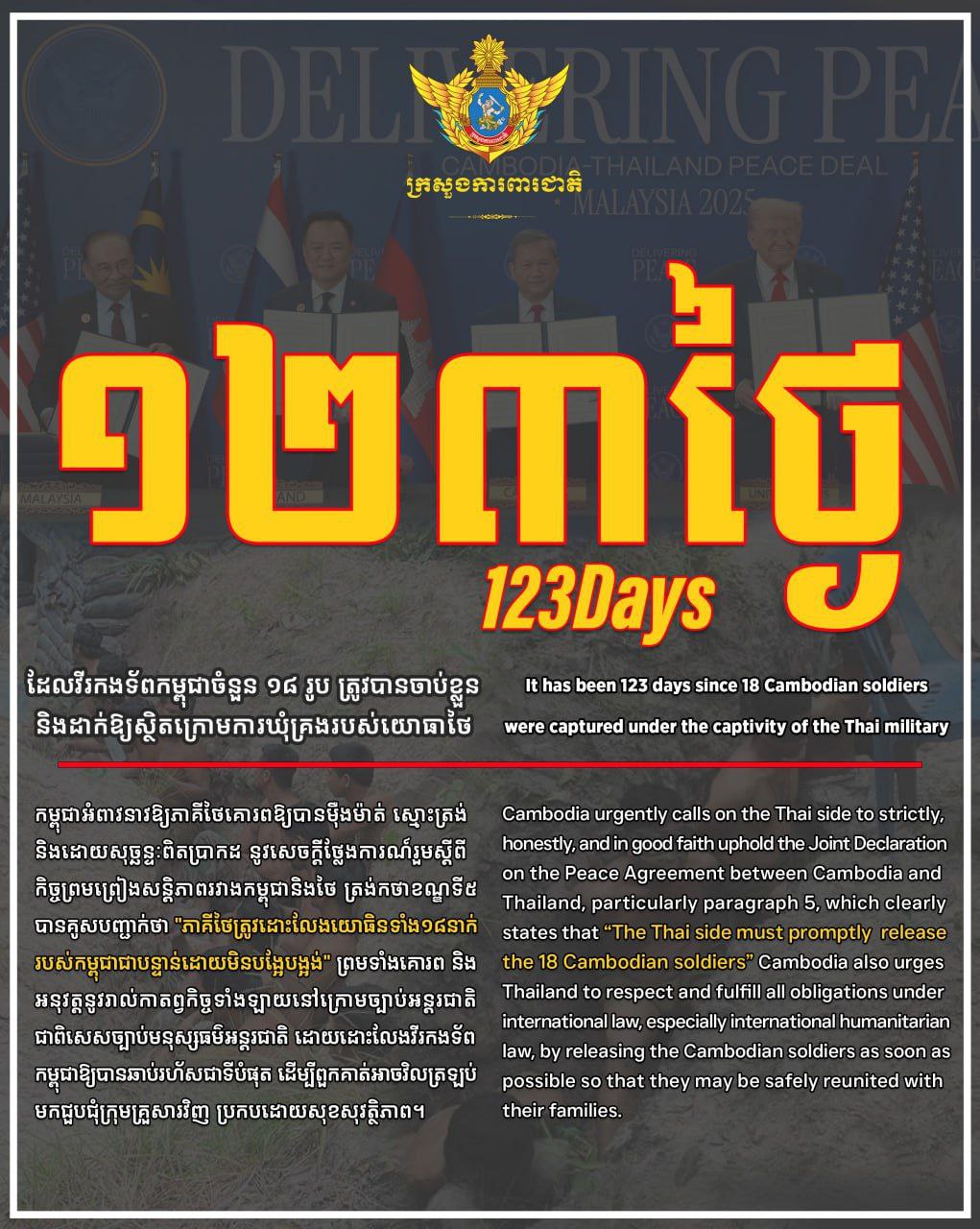 កម្ពុជាអំពាវនាវឱ្យភាគីថៃគោរពឱ្យបានម៉ឺងម៉ាត់ ស្មោះត្រង់ និងដោយសុច្ឆន្ទៈពិតប្រាកដ នូវសេចក្តីថ្លែងការណ៍រួមស្តីពីកិច្ចព្រមព្រៀងសន្តិភាពរវាងកម្ពុជានិងថៃ ត្រង់កថាខណ្ឌទី៥ បានគូសបញ្ជាក់ថា “ភាគីថៃត្រូវដោះលែងយោធិនទាំង១៨នាក់របស់កម្ពុជាជាបន្ទាន់ដោយមិនបង្អែបង្អង់” ព្រមទាំងគោរពនិងអនុវត្តនូវរាល់កាតព្វកិច្ចទាំងឡាយនៅក្រោមច្បាប់អន្តរជាតិ ជាពិសេសច្បាប់មនុស្សធម៌អន្តរជាតិ ដោយដោះលែងវីរកងទ័ពកម្ពុជាឱ្យបានឆាប់រហ័សជាទីបំផុត ដើម្បីពួកគាត់អាចវិលត្រឡប់មកជួបជុំក្រុមគ្រួសារវិញ ប្រកបដោយសុខសុវត្ថិភាព។