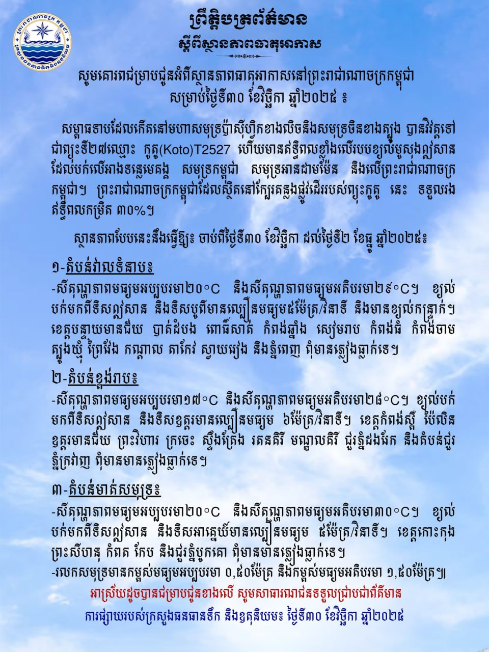 ក្រសួងធនធានទឹក ជូនដំណឹងអំពីស្ថានភាពធាតុអាកាសនៅកម្ពុជា សម្រាប់ថ្ងៃទី៣០ ខែវិច្ឆិកា ឆ្នាំ២០២៥