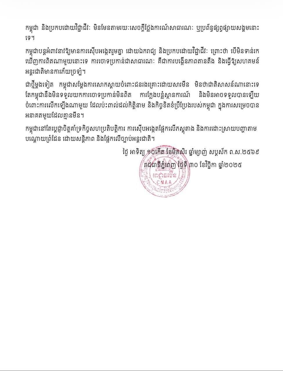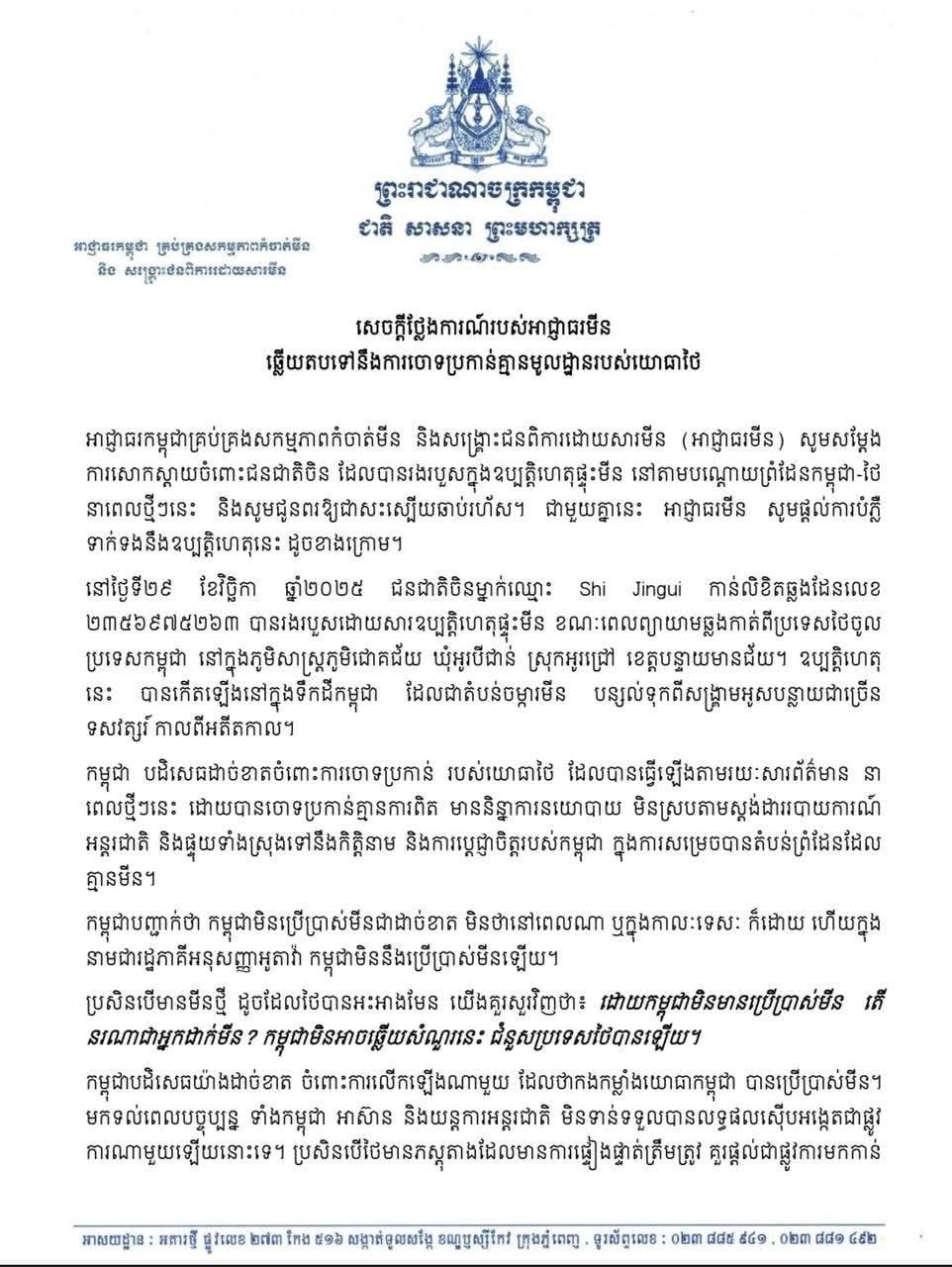 សម្តេចមហាបវរធិបតី ហ៊ុន ម៉ាណែត នាយករដ្ឋមន្ត្រីនៃព្រះរាជាណាចក្រកម្ពុជា ៖ សេចក្តីថ្លែងការណ៍របស់អាជ្ញាធរមីន ឆ្លើយតបទៅនឹងការចោទប្រកាន់គ្មានមូលដ្ឋានរបស់យោធាថៃ
