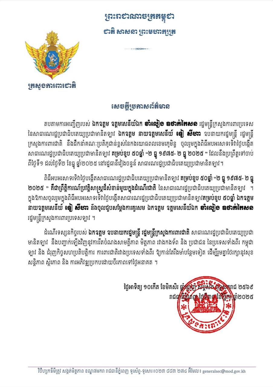 ក្រសួងការពារជាតិ៖ តបតាមការអញ្ជើញ របស់ឯកឧត្តម ឧត្តមសេនីយ៍ឯក ខាំលៀង ឧថាក់កៃសន រដ្ឋមន្ត្រីក្រសួងការពារប្រទេស នៃសាធារណរដ្ឋប្រជាធិបតេយ្យប្រជាមានិតឡាវ ឯកឧត្តម នាយឧត្តមសេនីយ៍ ទៀ សីហា ឧបនាយករដ្ឋមន្ត្រី រដ្ឋមន្ត្រី ក្រសួងការពារជាតិ នឹងដឹកនាំគណៈប្រតិភូជាន់ខ្ពស់នៃកងយោធពលខេមរភូមិន្ទ ចូលរួមក្នុងពិធីអបអរសាទរទិវាថ្ងៃបង្កើត សាធារណរដ្ឋប្រជាធិបតេយ្យប្រជាមានិតឡាវ គម្រប់ខួប ៥០ឆ្នាំ ។
