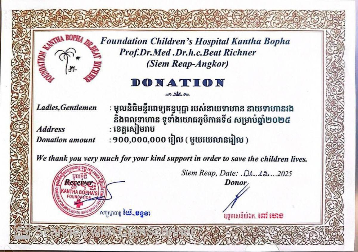 នៅថ្ងៃទី០១ ខែធ្នូ ឆ្នាំ២០២៥ ប្រតិភូយោធភូមិភាគទី៤ ដឹកនាំដោយឯកឧត្តម ឧត្តមសេនីយ៍ឯក ពៅ ហេង មេបញ្ជាការរងកងទ័ពជើងគោក មេបញ្ជាការយោធភូមិភាគទី៤ បាននាំយកថវិកាចំនួន ១០០,០០០,០០០រៀល (មួយរយលានរៀល) ប្រគល់ជូនដល់មន្ទីរពេទ្យជ័យវរ័្មនទី៧ (គន្ធបុប្ផា) ខេត្តសៀមរាប។