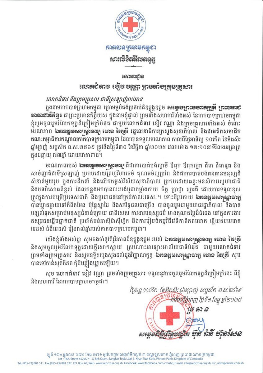 ភ្នំពេញ ៖ សម្តេចកិត្តិព្រឹទ្ធបណ្ឌិត ប៊ុន រ៉ានី ហ៊ុនសែន ប្រធានកាកបាទក្រហមកម្ពុជា នៅរសៀលថ្ងៃចន្ទទី១ ខែធ្នូ ឆ្នាំ២០២៥នេះ បានចាត់ប្រតិភូកាកបាទក្រហមកម្ពុជា ដឹកនាំដោយឯកឧត្តម ពិត ចំណាន សមាជិកគណៈកម្មាធិការកណ្តាលកាកបាទក្រហមកម្ពុជា និងសហការី អញ្ជើញគោរពវិញ្ញាណក្ខន្ធ និងចូលរួមរំលែកទុក្ខយ៉ាងក្រៀមក្រំបំផុតជាមួយលោកជំទាវ ខៀវ វណ្ណា ព្រមទាំងក្រុមគ្រួសារចំពោះមរណភាព ឯកឧត្តមសាស្ត្រាចារ្យ ហេង តៃគ្រី រដ្ឋលេខាធិការក្រសួងសុខាភិបាល និងជាអតីតសមាជិកគណៈកម្មាធិការកណ្តាលកាកបាទក្រហមកម្ពុជា ដែលបានទទួលមរណភាព កាលពីថ្ងៃអាទិត្យ ១០កើត ខែមិគសិរ ឆ្នាំម្សាញ់ សប្តស័ក ព.ស.២៥៦៩ ត្រូវនឹងថ្ងៃទី៣០ ខែវិច្ឆិកា ឆ្នាំ២០២៥ វេលាម៉ោង ១២:១០នាទីរំលងអធ្រាត្រ ក្នុងជន្មាយុ ៧៧ឆ្នាំ ដោយរោគាពាធ។