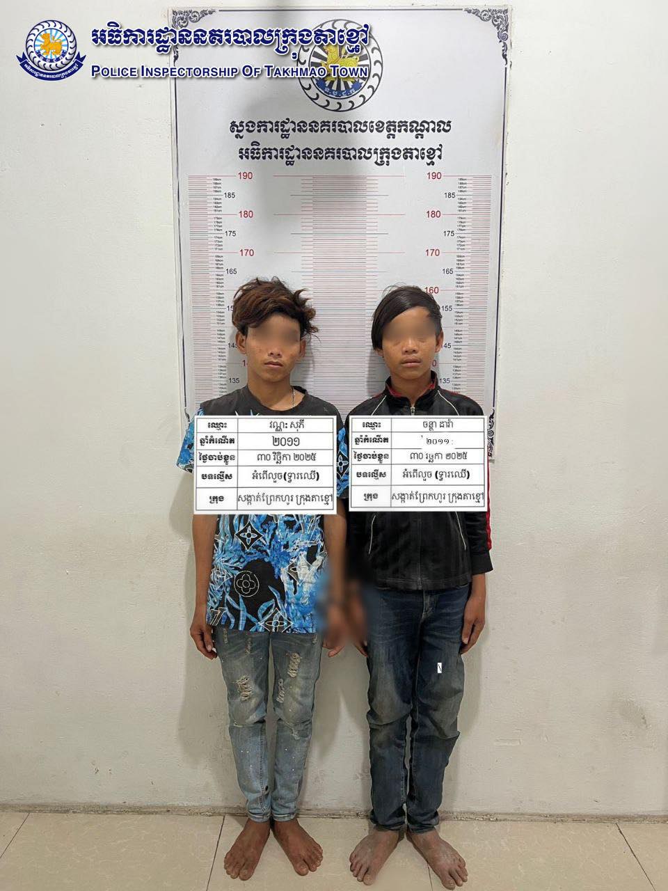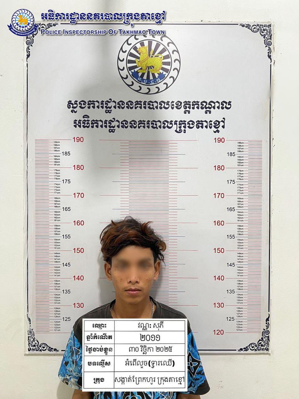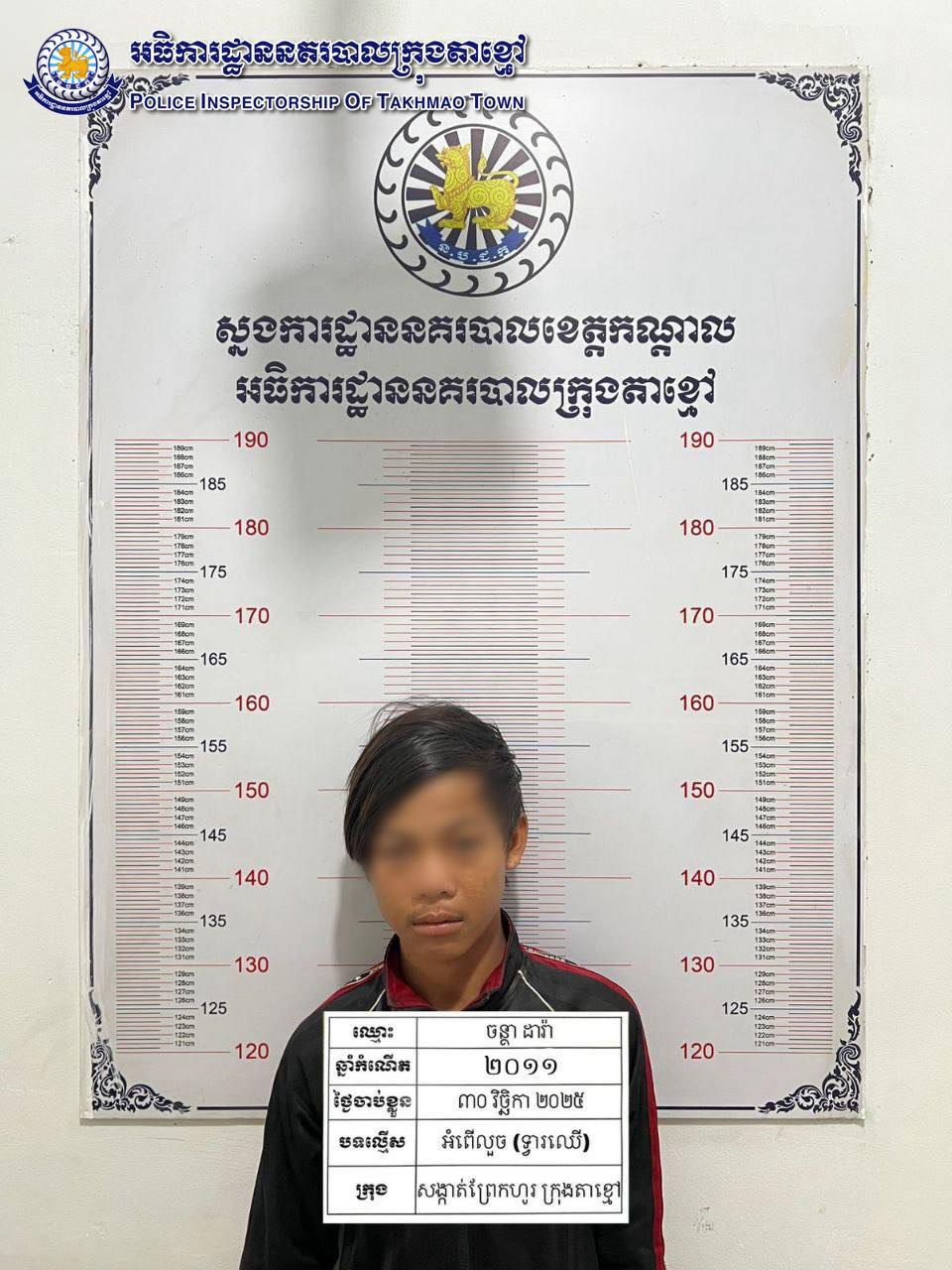 ឃាត់ខ្លួនជនសង្ស័យ ចូលគាស់លួចយកសម្ភារៈ និង (ទ្វារឈើ) ក្នុងផ្ទះទុកចោល ស្ថិតភូមិព្រែកហូរលិច១ សង្កាត់ព្រែកហូរ ក្រុងតាខ្មៅ