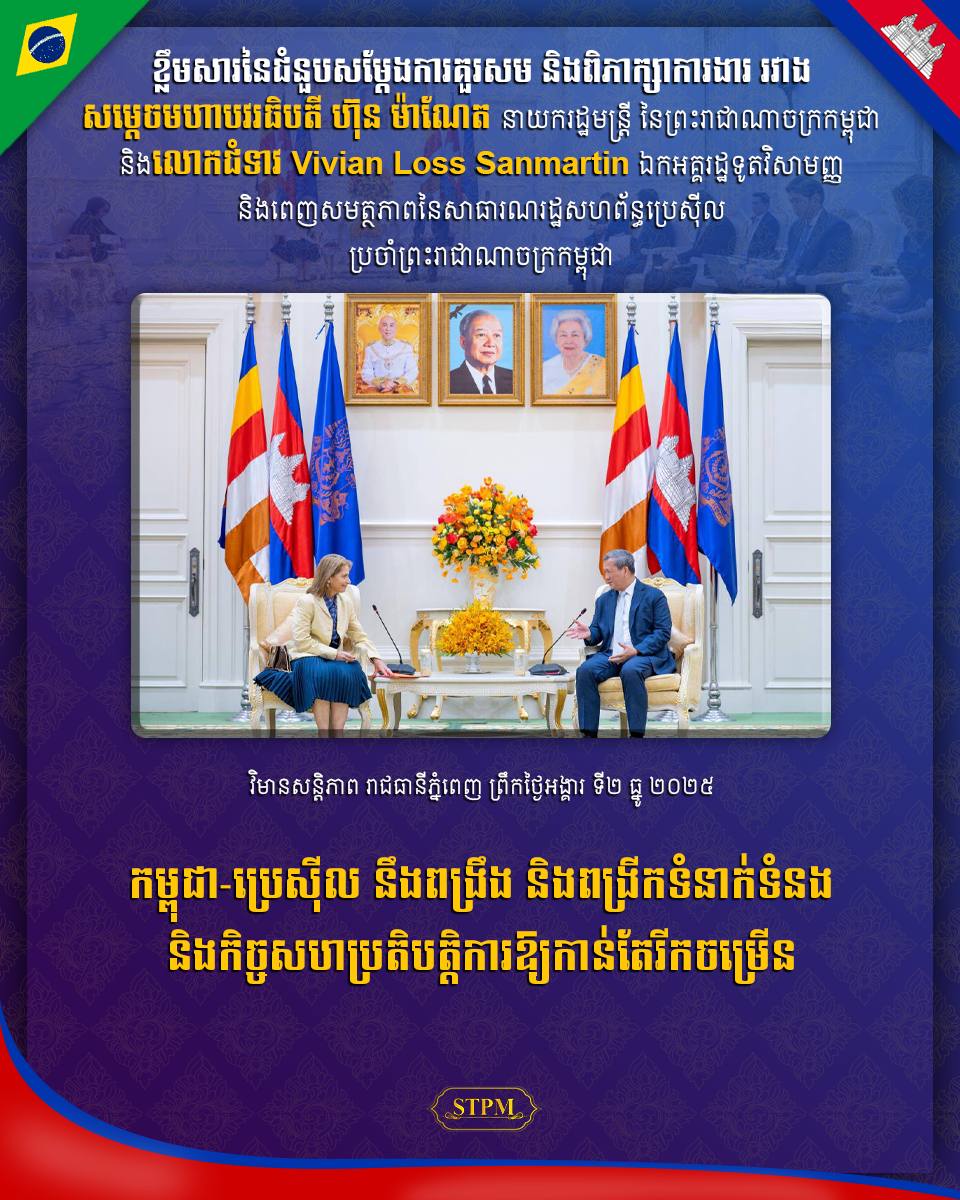នាថ្ងៃទី០២ ខែធ្នូ ឆ្នាំ២០២៥, សម្តេចមហាបវរធិបតី ហ៊ុន ម៉ាណែត នាយករដ្ឋមន្រ្តី នៃព្រះរាជាណាចក្រកម្ពុជា បានអនុញ្ញាតឱ្យ លោកជំទាវ វីវៀន ឡូស សាន់ម៉ាទីន (Vivian Loss Sanmartin) ឯកអគ្គរដ្ឋទូតនៃសាធារណរដ្ឋសហព័ន្ធប្រេស៊ីលប្រចាំកម្ពុជា ចូលជួបសម្តែងការគួរសម និងពិភាក្សាការងារ នៅវិមានសន្តិភាព។