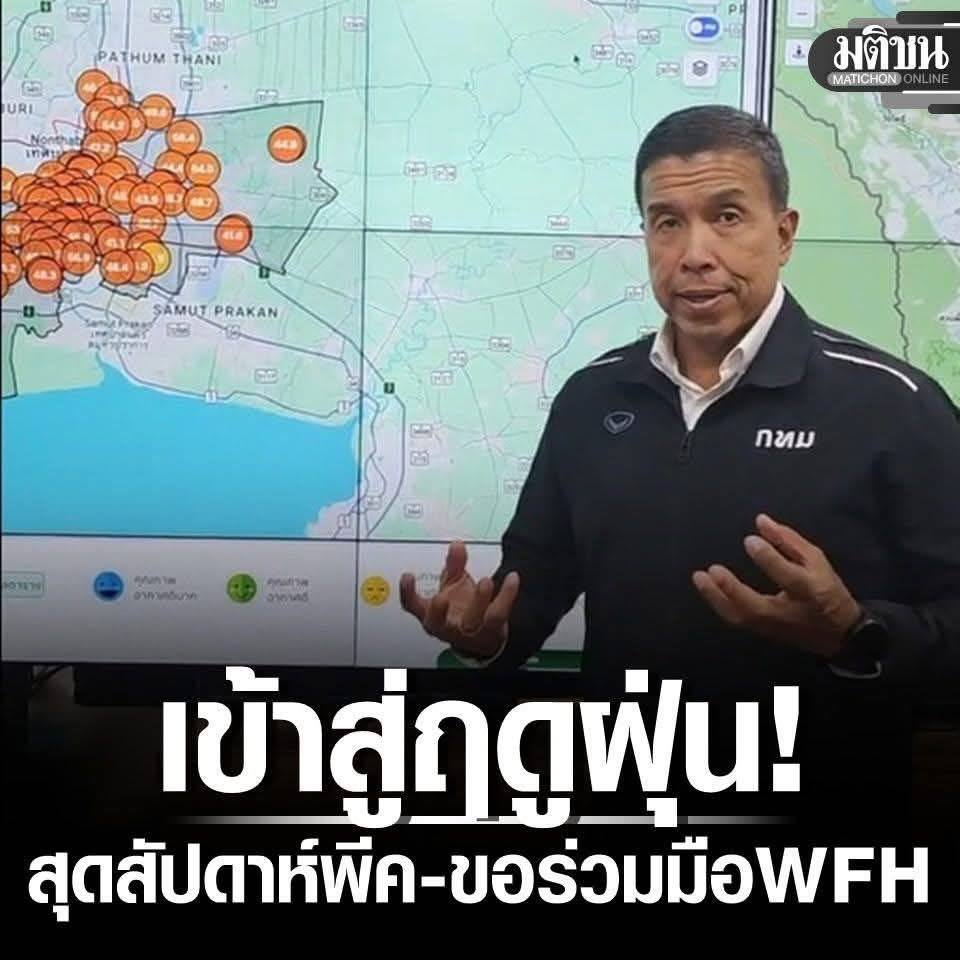 ប្រទេសថៃ ៖ នៅពេលដែលរដូវវស្សាបញ្ចប់ រដូវធូលីចាប់ផ្តើម! អភិបាលក្រុង Chadchart បានចង្អុលបង្ហាញថា ចុងសប្តាហ៍នេះកម្រិត PM 2.5 នឹងប្រមូលផ្តុំយ៉ាងខ្លាំង ហើយស្នើសុំកិច្ចសហប្រតិបត្តិការសម្រាប់ការធ្វើការពីផ្ទះនៅថ្ងៃទី 4 ខែធ្នូ។