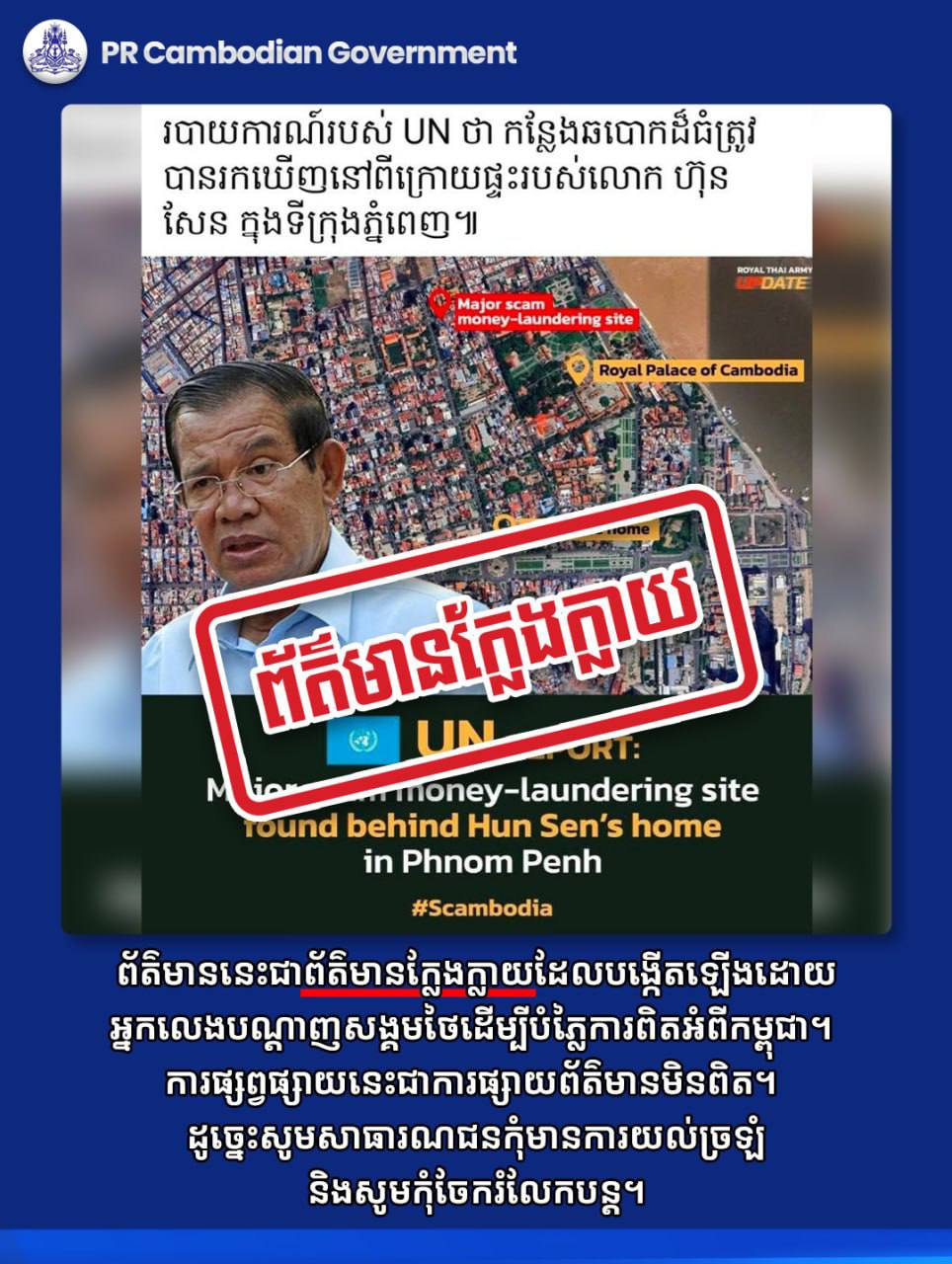 ព័ត៌មាននេះជាព័ត៌មានក្លែងក្លាយ ដែលបង្កើតឡើងដោយអ្នកលេងបណ្តាញសង្គមថៃដើម្បីបំភ្លៃការពិតអំពីកម្ពុជា។
