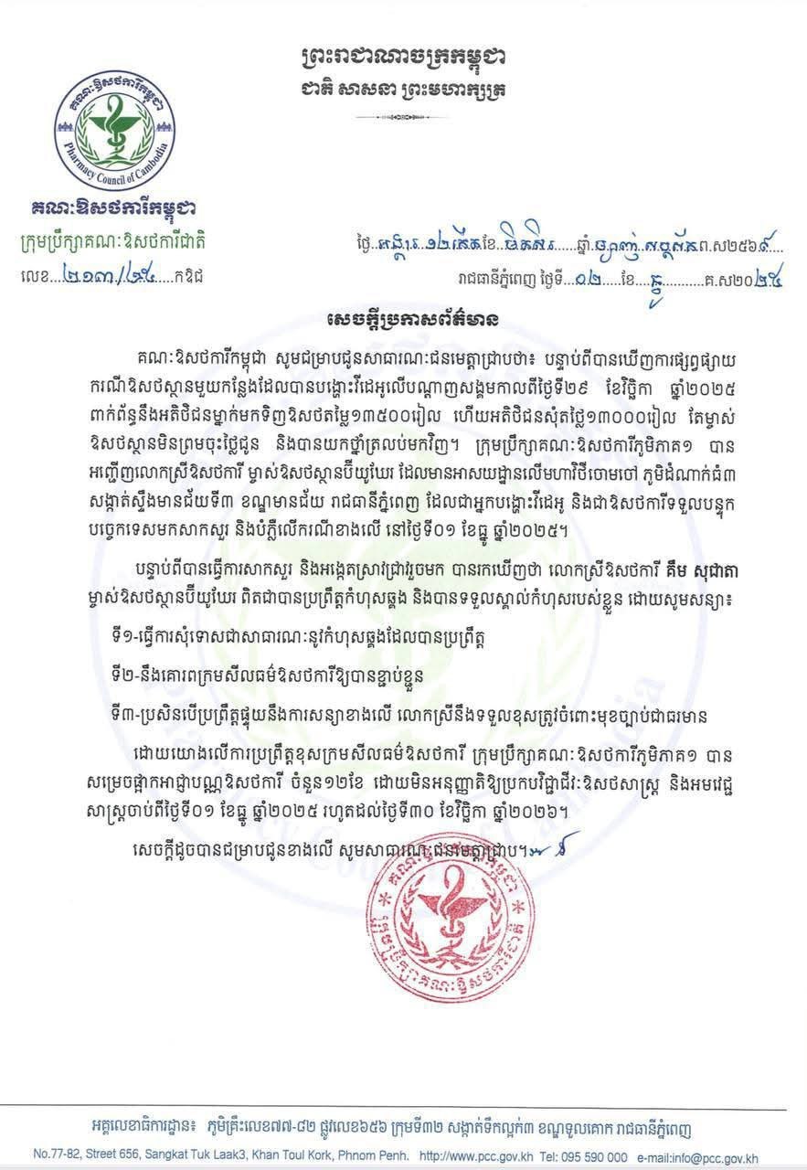 នៅក្នុងសេចក្តីជូនដំណឹងរបស់គណៈឱសថការីកម្ពុជា ដែលបណ្តាញព័ត៌មាន ទទួលបាននៅល្ងាចថ្ងៃទី០២ ខែធ្នូ ឆ្នាំ២០២៥នេះ បានបញ្ជាក់ឱ្យដឹងថា បន្ទាប់ពីបានឃើញការផ្សព្វផ្សាយ ករណីឱសថស្ថានមួយកន្លែងដែលបានបង្ហោះវីដេអូលើបណ្តាញសង្គមកាលពីថ្ងៃទី២៩ ខែវិច្ឆិកា ឆ្នាំ២០២៥ ពាក់ព័ន្ធនឹងអតិថិជនម្នាក់មកទិញឱសថតម្លៃ ១៣ ៥០០រៀល ហើយអតិថិជនសុំតថ្លៃ ១៣ ០០០រៀល តែម្ចាស់ឱសថស្ថានមិនព្រមចុះថ្លៃជូន និងបានយកថ្នាំត្រលប់មកវិញ។