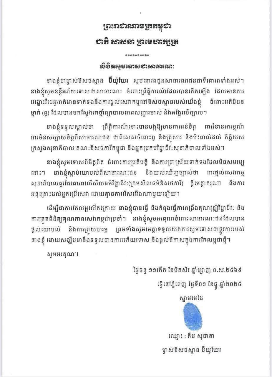 ទី៣៖ ប្រសិនបើប្រព្រឹត្តផ្ទុយនឹងការសន្យាខាងលើ លោកស្រីនឹងទទួលខុសត្រូវចំពោះមុខច្បាប់ជាធរមាន ដោយយោងលើការប្រព្រឹត្តខុសក្រមសីលធម៌ឱសថការី ក្រុមប្រឹក្សាគណៈឱសថការីភូមិភាគ១ បានសម្រេចផ្អាកអាជ្ញាបណ្ណឱសថការី ចំនួន១២ខែ ដោយមិនអនុញ្ញាតិឱ្យប្រកបវិជ្ជាជីវៈឱសថសាស្ត្រ និងអមវេជ្ជសាស្រ្តចាប់ពីថ្ងៃទី០១ ខែធ្នូ ឆ្នាំ២០២៥ រហូតដល់ថ្ងៃទី៣០ ខែវិច្ឆិកា ឆ្នាំ២០២៦៕