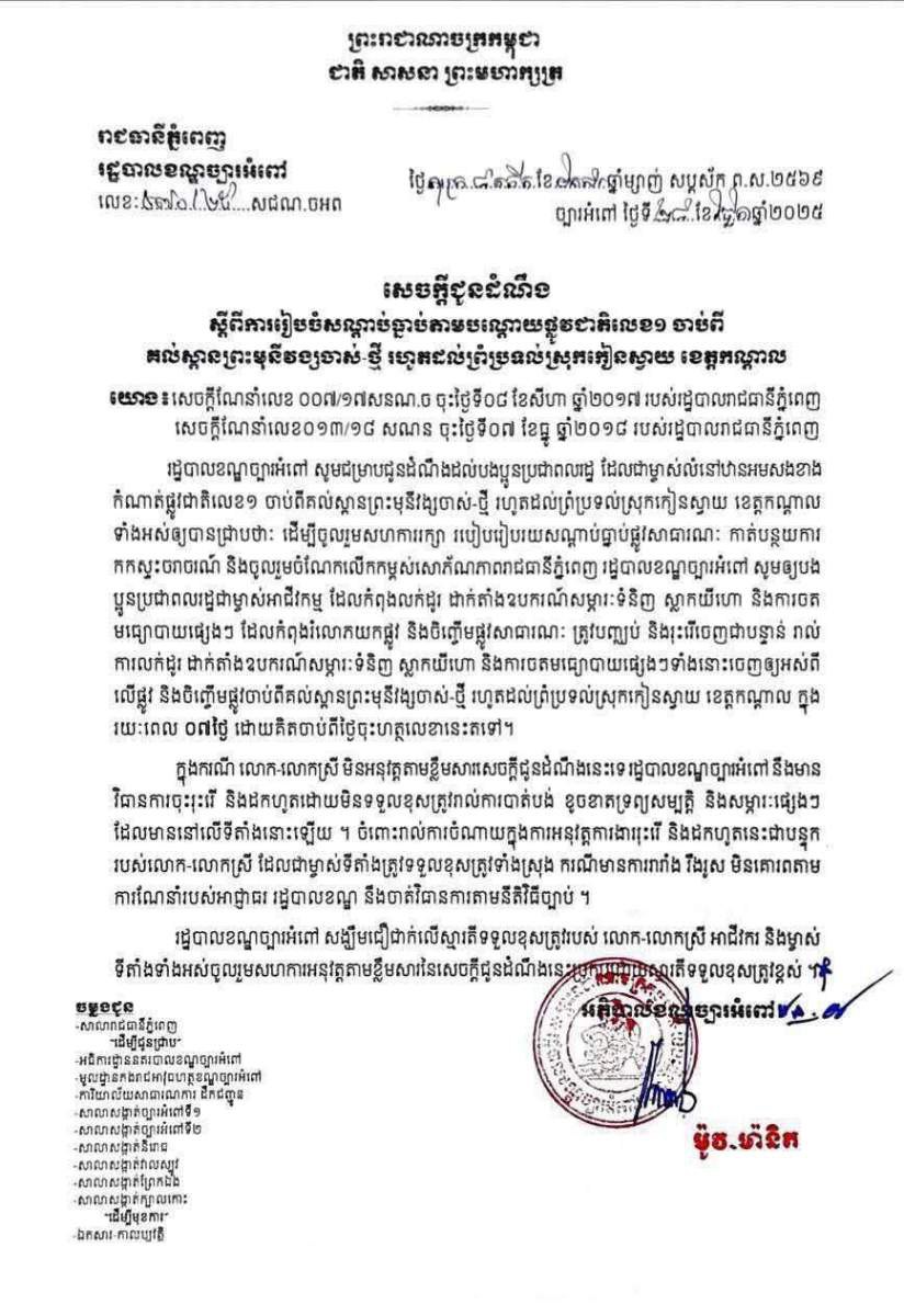 លោកអភិបាលរងបន្ថែមថា ៖ មុនឈានដល់ការចុះអនុវត្តវិធានការរដ្ឋបាល កម្លាំងគណៈបញ្ជាការឯកភាពរដ្ឋបាលខណ្ឌ បានផ្សព្វផ្សាយតាមរយៈការចេញសេចក្តីជូនដំណឹង និងចុះជម្រាបប្រជាពលរដ្ឋដោយផ្ទាល់មាត់ និងលាយលក្ខ័អក្សរផងដែរ ដើម្បីឲ្យពួកគាត់មានការចូលរួម ជាមួយការអនុវត្តនេះឲ្យមានប្រសិទ្ធិភាព ។ សេចក្តីជូនដំណឹងរបស់រដ្ឋបាលខណ្ឌនេះ គឺមានរយៈពេល០៧ថ្ងៃ គិតចាប់ពីថ្ងៃទី២៨ ខែវិច្ឆិកា ឆ្នាំ២០២៥មក ។