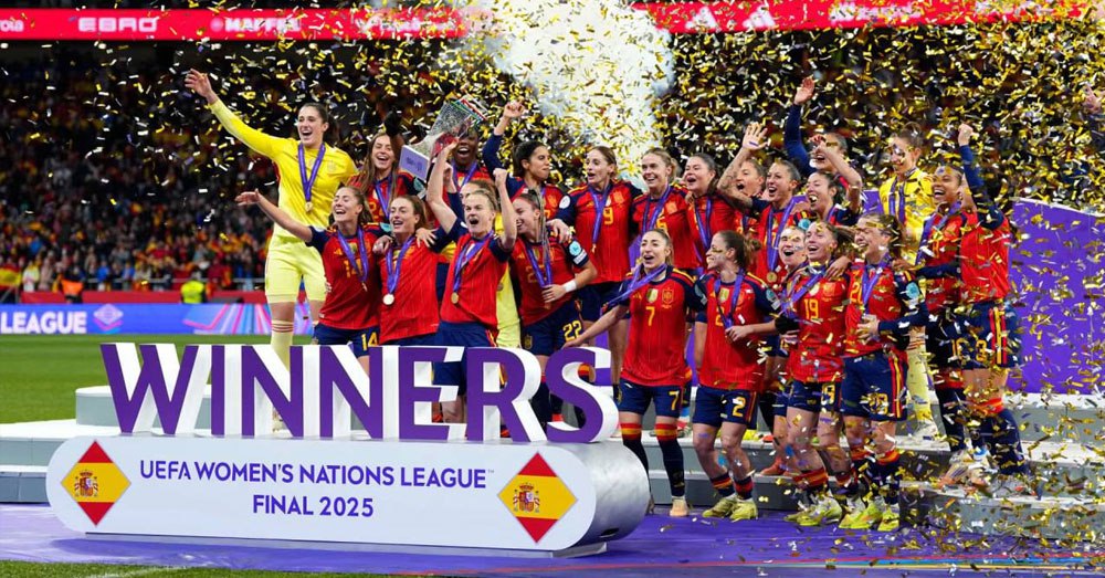 (បរទេស)៖ ក្រុមបាល់ទាត់ជម្រើសជាតិនារីអេស្ប៉ាញ បានបន្តគ្រប់គ្រងពានលីគនារីប្រចាំទ្វីបអឺរ៉ុប UEFA Women’s Nations League 2025 ក្រោយយកឈ្នះគូប្រជែងស្រ្តីអាល្លឺម៉ង់ ៣ទល់នឹង០ ដាច់នាយប់មិញ ក្នុងជើងទី២ ផ្តាច់ព្រ័ត្រ