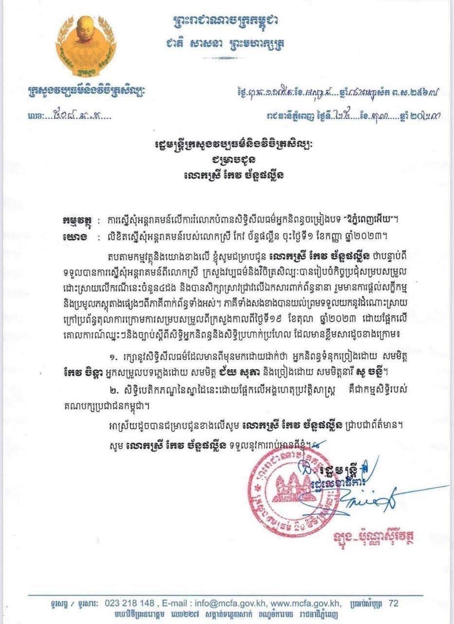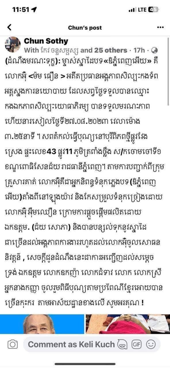 ខ្ញុំសូមលោក chun sothy ធ្វើការកែតម្រូវព័ត៌មាន ដែលបានផ្សាយខុស។ការខិតខំស្រាវជ្រាវ និងពន្យល់របស់ខ្ញុំ គឺដើម្បីជៀសវាងការយល់ច្រឡំទៅថ្ងៃក្រោយព្រោះបទចម្រៀង(ឱភ្នំពេញអើយ) ជាបទចម្រៀងប្រវត្តិសាស្ត្រ»៕