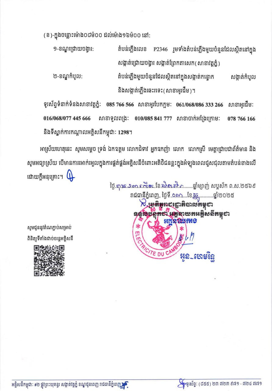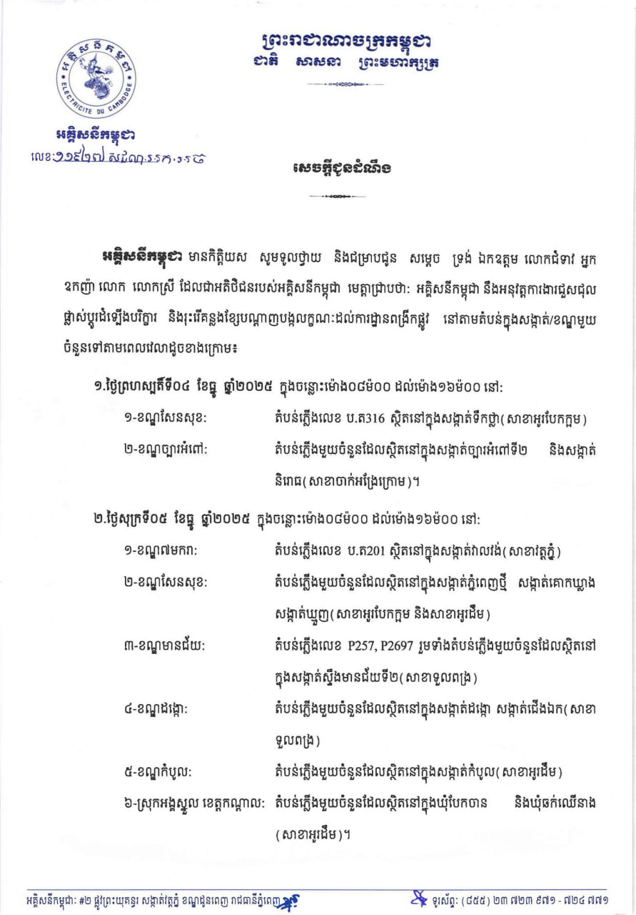 សូមអានសេចក្តីជូនដំណឹងរបស់អគ្គិសនីកម្ពុជា ដូចខាងក្រោម ៖