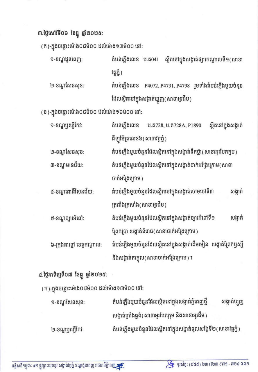 EDC ជូនដំណឹងពីការរអាក់រអួលចរន្ត តាមតំបន់សង្កាត់ខណ្ឌមួយចំនួនចាប់ពីថ្ងៃនេះ ដល់ថ្ងៃទី០៧ ខែធ្នូ ដើម្បីរុះរើគន្លងខ្សែបណ្តាញ ផ្លាស់ប្តូរ តម្លើងបរិក្ខារងាយស្រួលដល់ការដ្ឋានពង្រីកផ្លូវ