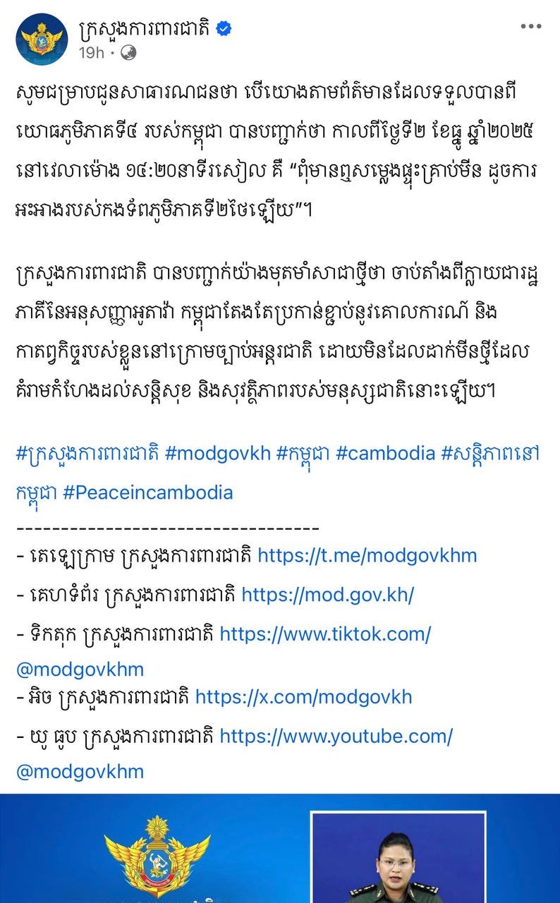 ក្រសួងការពារជាតិ នៃព្រះរាជាណាចក្រកម្ពុជា បានបដិសេធដាច់អហង្កាចំពោះសម្តីចោទ ប្រកាន់របស់កងទ័ពភូមិភាគទី២ថៃ ដែលបានផ្សាយថា «មានករណីផ្ទុះមីនចំនួនមួយគ្រាប់ នៅតំបន់ហួយតាម៉ារៀ កាលពីថ្ងៃទី២ ខែធ្នូ ឆ្នាំ២០២៥ នៅវេលាម៉ោង ១៤៖២០នាទីរសៀល និងបានចោទប្រកាន់ថាជាមីនដែលបានដាក់ដោយកម្ពុជា»។