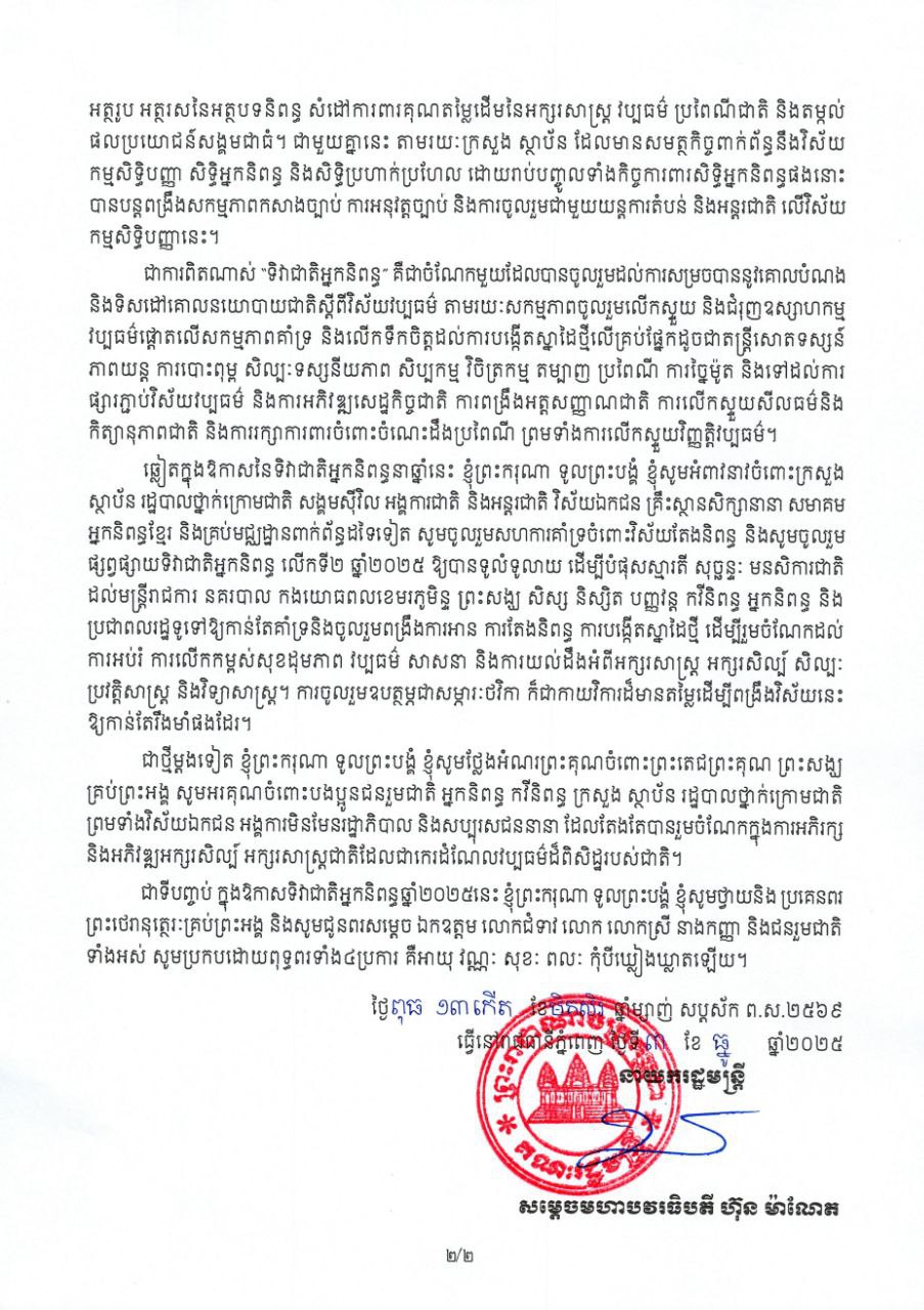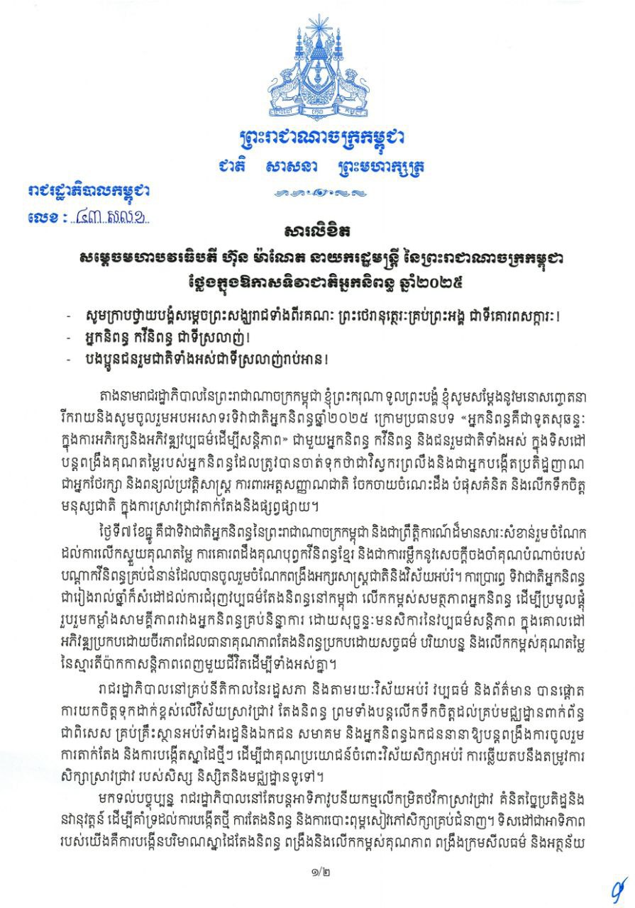 សារលិខិត សម្តេចមហាបវរធិបតី ហ៊ុន ម៉ាណែត នាយករដ្ឋមន្ត្រី នៃព្រះរាជាណាចក្រកម្ពុជា ថ្លែងក្នុងឱកាសទិវាជាតិអ្នកនិពន្ធ ឆ្នាំ២០២៥ ៕