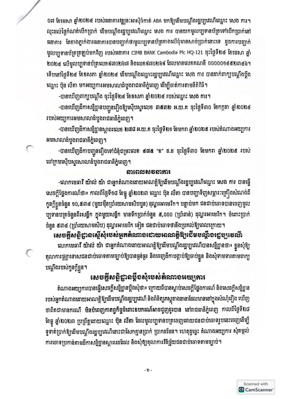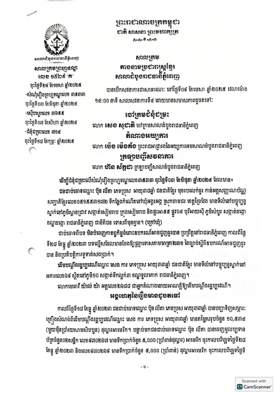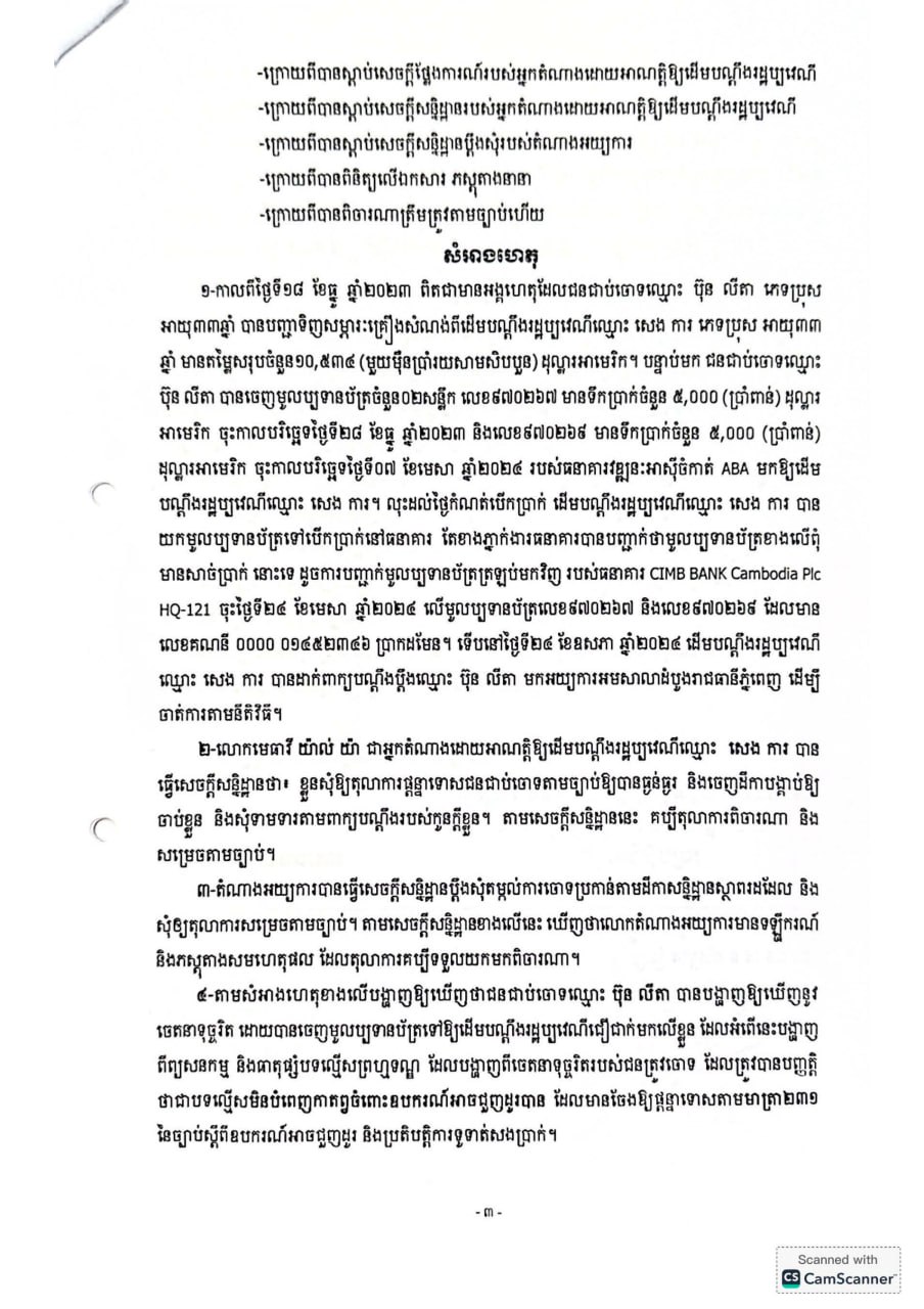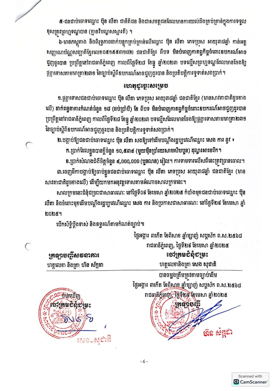 ក្នុងសាលក្រមរបស់សាលាដំបូងរាជធានីភ្នំពេញ បញ្ជាក់ថា ជនជាប់ចោទដែលសមត្ថកិច្ចឃាត់ខ្លួនឈ្មោះ ប៊ុន លីតា និងបង្គាប់ឲ្យផ្ដន្ទាទោសដាក់ពន្ធនាគារ រយៈពេល១៨ខែ ពីបទ «មិនបំពេញកាតព្វកិច្ចចំពោះឧបករណ៍អាចជួញដូរបាន» ប្រព្រឹត្តនៅរាជធានីភ្នំពេញ កាលពីថ្ងៃទី២៨ ខែធ្នូ ឆ្នាំ២០២៣ បទល្មើសដែលមានចែងឲ្យផ្ដន្ទាទោសតាមមាត្រា២៣១ នៃច្បាប់ស្ដីពីឧបករណ៍អាចជួញដូរបាន និងប្រតិបត្តិការទូទាត់សងប្រាក់។