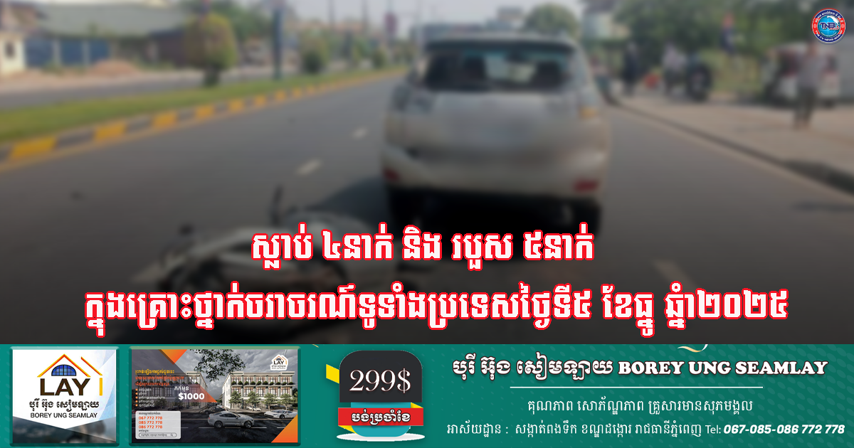 ស្លាប់៤នាក់ និងរបួស៥នាក់ ក្នុងគ្រោះថ្នាក់ចរាចរណ៍ទូទាំងប្រទេសថ្ងៃទី៥ ខែធ្នូ ឆ្នំា២០២៥