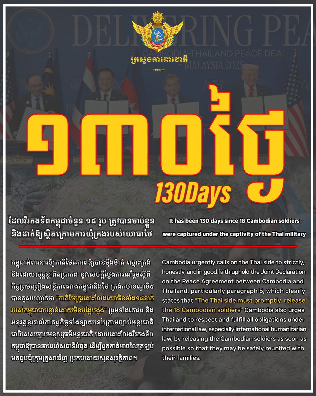 កម្ពុជាអំពាវនាវឱ្យភាគីថៃគោរពឱ្យបានម៉ឺងម៉ាត់ ស្មោះត្រង់ និងដោយសុច្ឆន្ទៈពិតប្រាកដ នូវសេចក្តីថ្លែងការណ៍រួមស្តីពីកិច្ចព្រមព្រៀងសន្តិភាពរវាងកម្ពុជានិងថៃ ត្រង់កថាខណ្ឌទី៥ បានគូសបញ្ជាក់ថា “ភាគីថៃត្រូវដោះលែងយោធិនទាំង១៨នាក់របស់កម្ពុជាជាបន្ទាន់ដោយមិនបង្អែបង្អង់” ព្រមទាំងគោរពនិងអនុវត្តនូវរាល់កាតព្វកិច្ចទាំងឡាយនៅក្រោមច្បាប់អន្តរជាតិ ជាពិសេសច្បាប់មនុស្សធម៌អន្តរជាតិ ដោយដោះលែងវីរកងទ័ពកម្ពុជាឱ្យបានឆាប់រហ័សជាទីបំផុត ដើម្បីពួកគាត់អាចវិលត្រឡប់មកជួបជុំក្រុមគ្រួសារវិញ ប្រកបដោយសុខសុវត្ថិភាព។