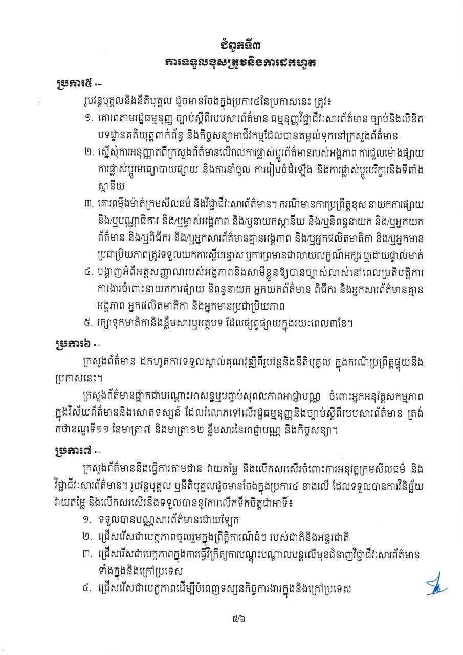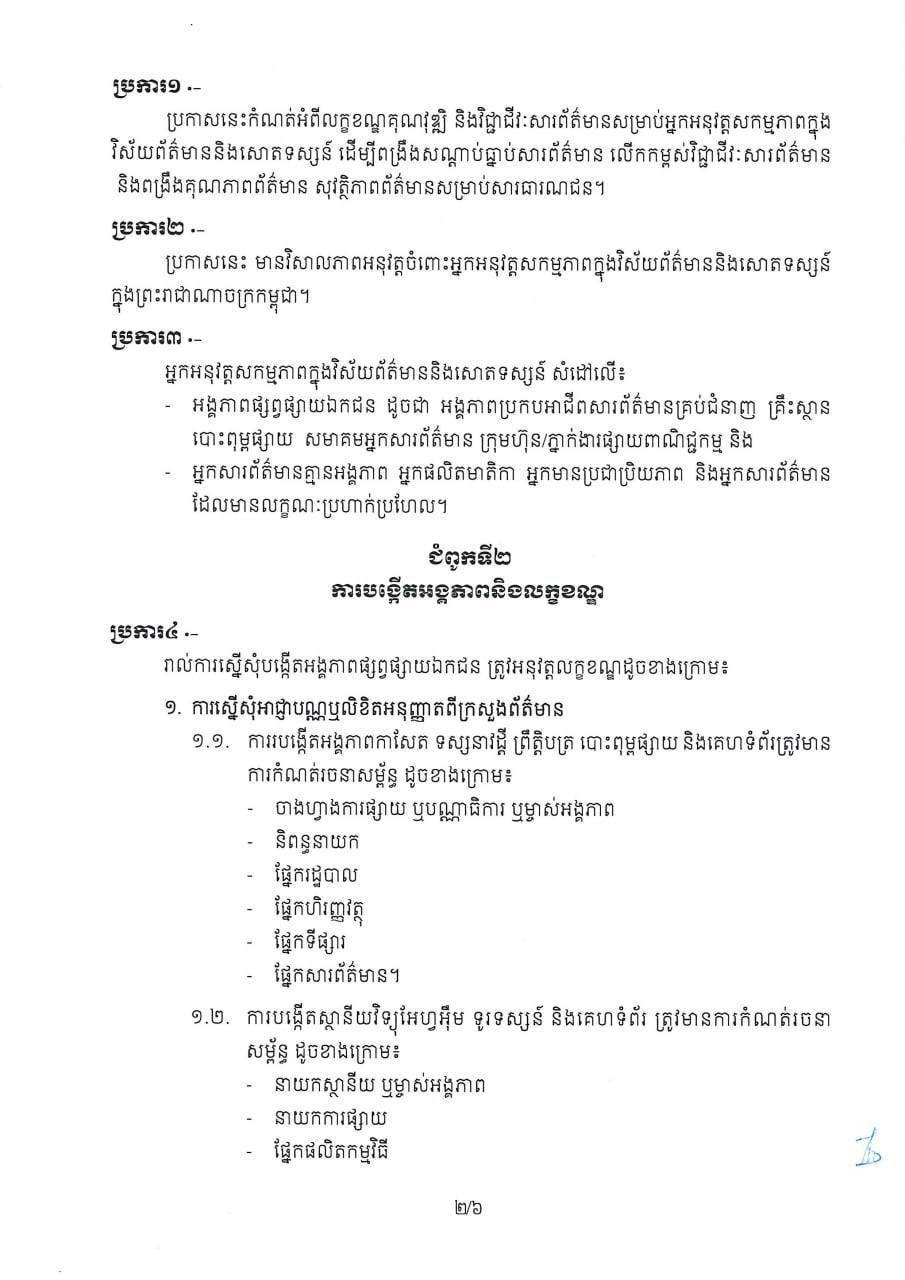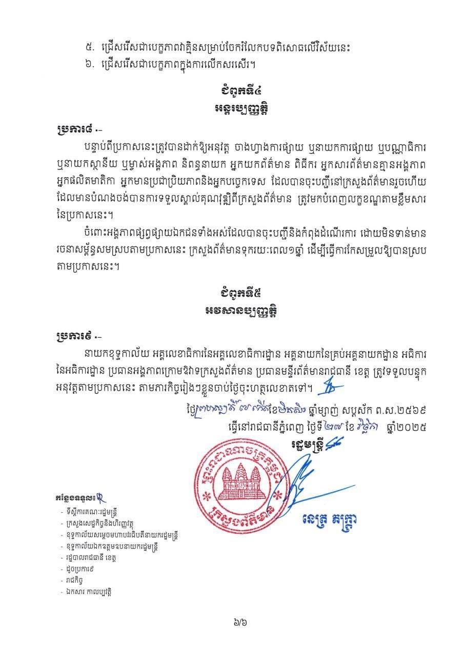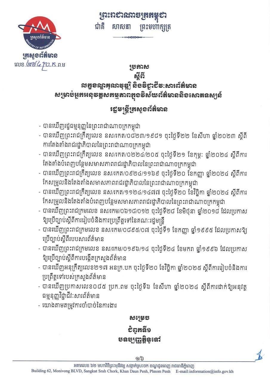 នៅថ្ងៃទី ២៧ ខែវិច្ឆិកា ឆ្នាំ ២០២៥ កន្លងទៅថ្មីៗនេះ ក្រសួងព័ត៌មាន បានចេញសេចក្ដីប្រកាសស្ដីពីលក្ខខណ្ឌគុណវុឌ្ឍិ និង វិជ្ជាជីវៈសារព័ត៌មានសម្រាប់អ្នកអនុវត្តសកម្មភាពក្នុងវិស័យព័ត៌មាន និង សោតទស្សន៍ ក្នុងគោលបំណងដើម្បីកំណត់អំពីលក្ខខណ្ឌគុណវុឌ្ឍិ និង វិជ្ជាជីវៈសារព័ត៌មានសម្រាប់អ្នកអនុវត្តសកម្មភាពក្នុងវិស័យព័ត៌មាន និង សោតទស្សន៍ ដើម្បីពង្រឹងសណ្ដាប់ធ្នាប់សារព័ត៌មាន លើកកម្ពស់វិជ្ជាជីវៈសារព័ត៌មាន និង ពង្រឹងគុណភាពព័ត៌មាន សុវត្ថិភាពព័ត៌មានសម្រាប់សាធារណជន។