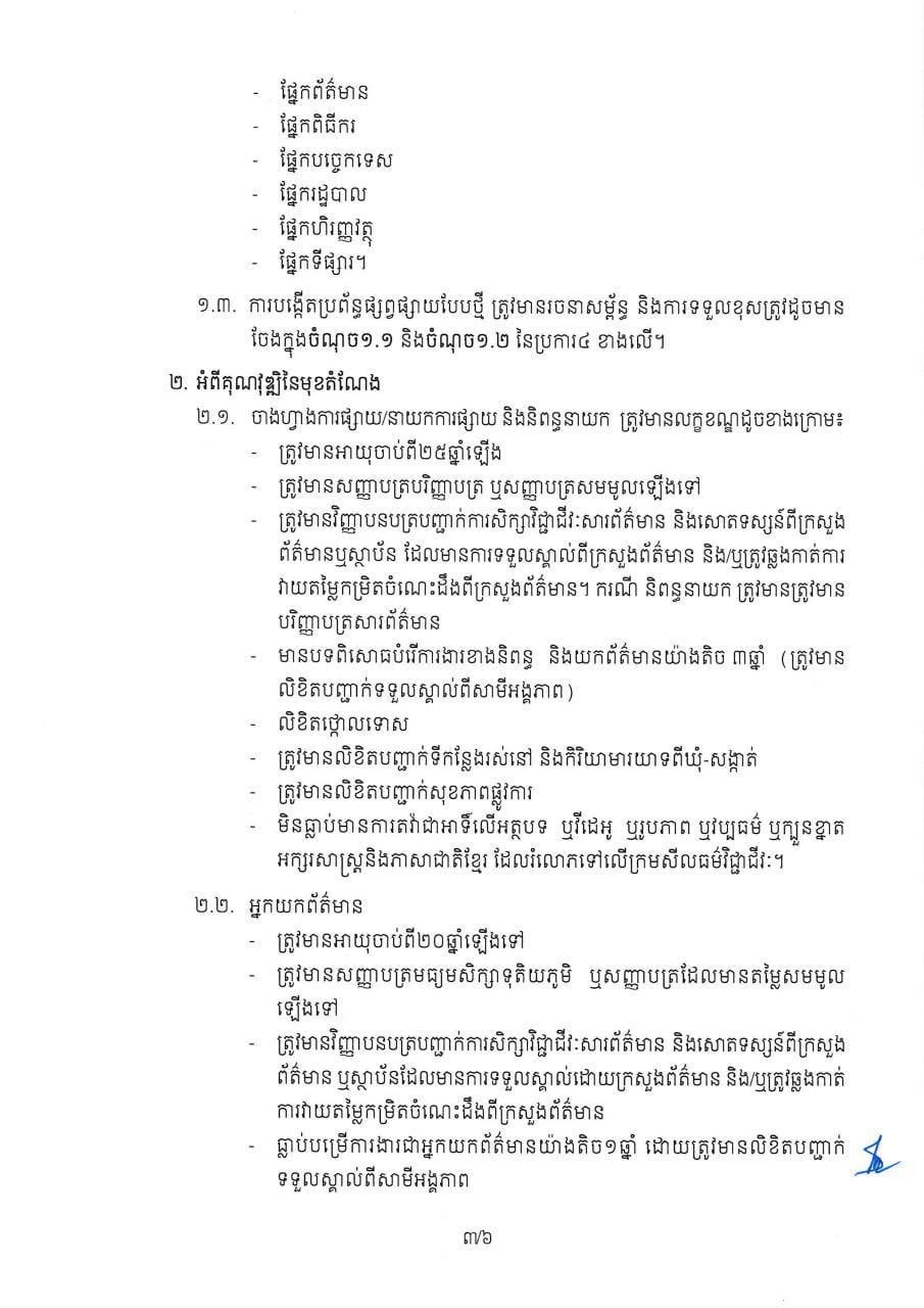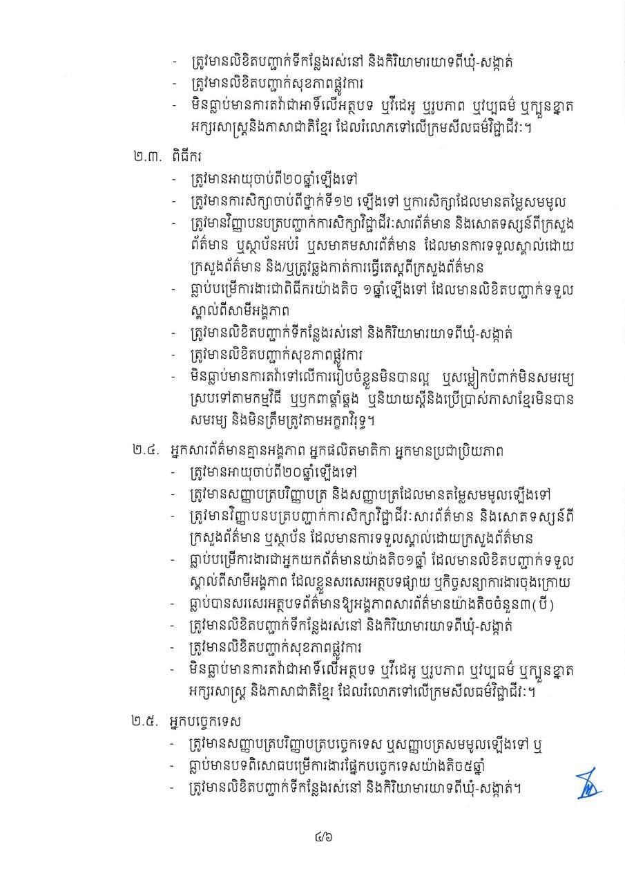 ជាមួយគ្នានោះដែរ ក្នុងសេចក្ដីប្រកាសក៏បានកំណត់ឱ្យបុគ្គលរៀបរាប់ខាងលើ មានបទពិសោធធ្លាប់បម្រើការងារជាអ្នកយកព័ត៌មានយ៉ាងតិច ១ ឆ្នាំ ដែលមានលិខិតបញ្ជាក់ទទួលស្គាល់ពីសាមីអង្គភាពដែលខ្លួនសរសេរអត្ថបទផ្សាយ ឬកិច្ចសន្យាការងារចុងក្រោយ។ ធ្លាប់សរសេរអត្ថបទឱ្យអង្គភាពសារព័ត៌មានយ៉ាងតិចចំនួន ៣។ ត្រូវមានលិខិតបញ្ជាក់ទីកន្លែងរស់នៅ និង កិរិយាមារយាទពីឃុំ-សង្កាត់។ ត្រូវមានលិខិតបញ្ជាក់សុខភាពផ្លូវការ និង មិនធ្លាប់មានការតវ៉ាជាអាទិ៍លើអត្ថបទ ឬវីដេអូ ឬរូបភាព ឬវប្បធម៌ ឬក្បួនខ្នាតអក្សរសាស្ត្រ និង ភាសាជាតិខ្មែរ ដែលរំលោភទៅលើក្រមសីលធម៌វិជ្ជាជីវៈ៕