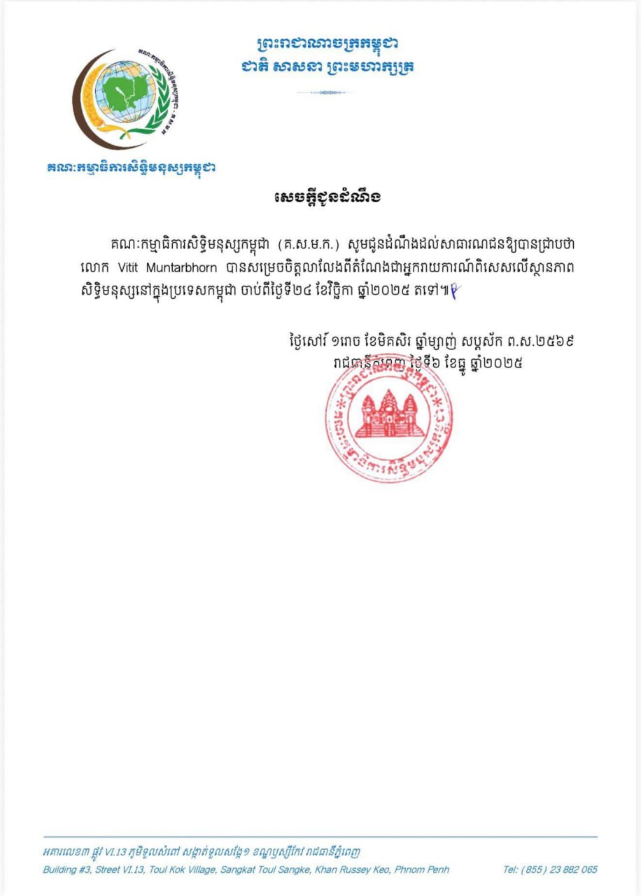 ឯកឧត្តម កែវ រ៉េមី ទេសរដ្ឋមន្ត្រី និងជាប្រធានគណៈកម្មាធិការសិទ្ធិមនុស្សកម្ពុជា៖ «លោក វីទីត ម៉ុនតាប៊ន អ្នករាយការណ៍ពិសេសស្តីពីសិទ្ធិមនុស្សនៅកម្ពុជាបានធ្វើលិខិតលាលែងពីមុខតំណែងហើយ។