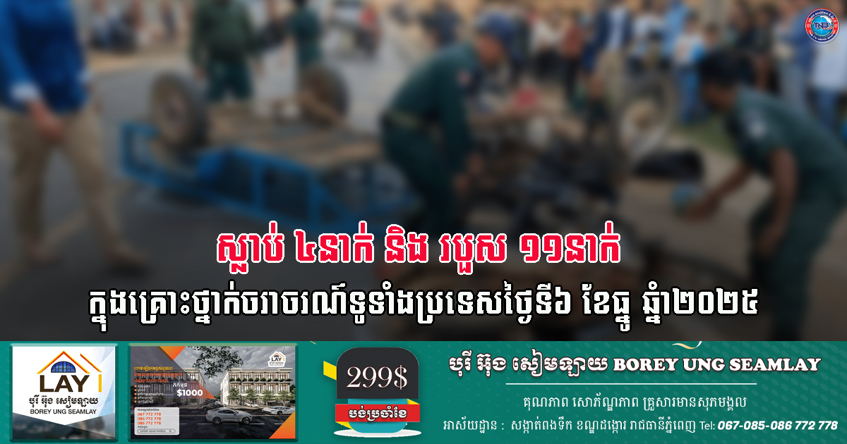 ស្លាប់៤នាក់ និងរបួស១១នាក់ ក្នុងគ្រោះថ្នាក់ចរាចរណ៍ទូទាំងប្រទេសថ្ងៃទី៦ ខែធ្នូ ឆ្នំា២០២៥