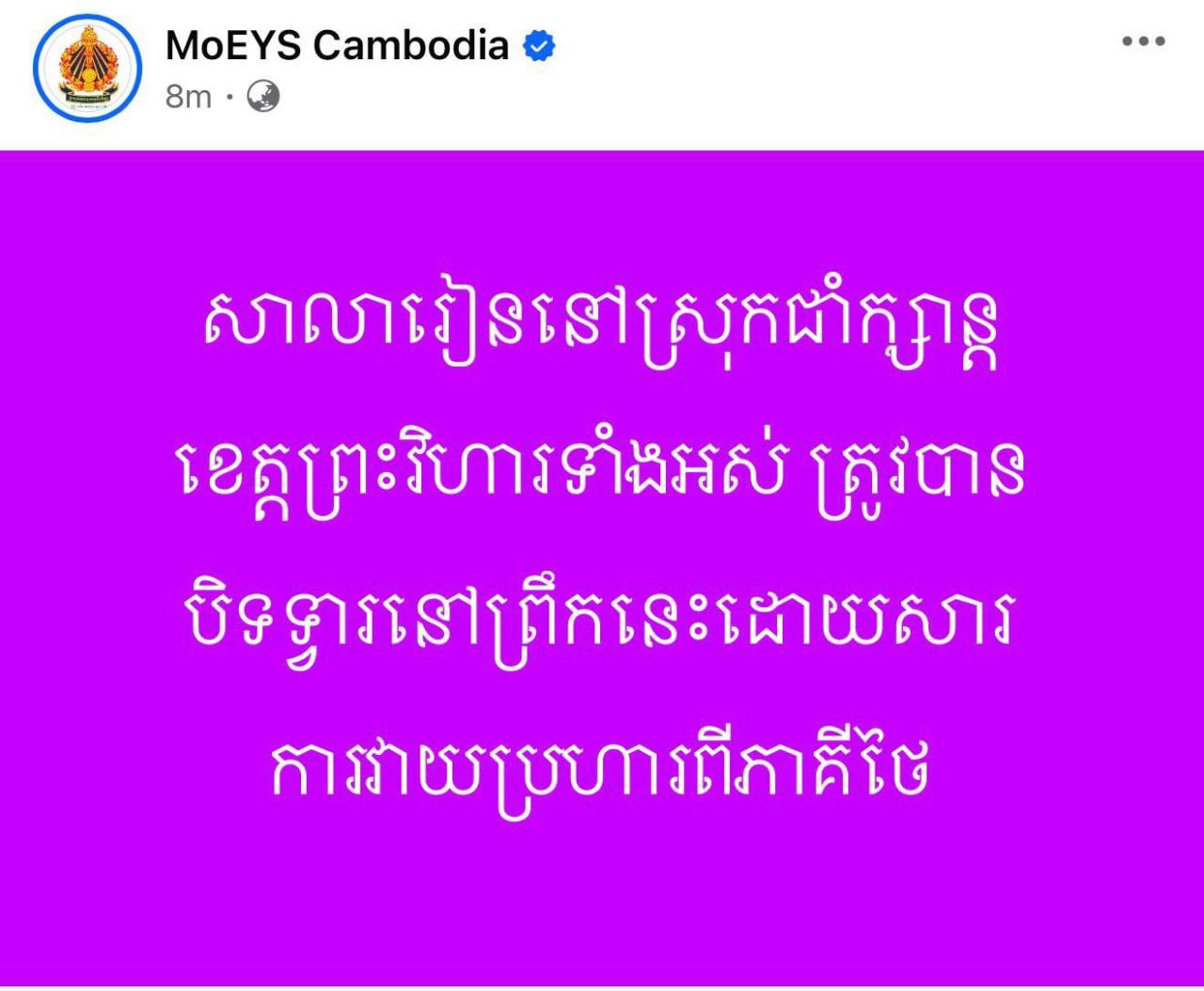 ក្រសួងអប់រំ ៖ «សាលារៀននៅស្រុកបន្ទាយអំពិលទាំងអស់ និងសាលាមួយចំនួននៅខេត្តឧត្ដរមានជ័យនៅតាមបន្ទាត់ព្រំដែន ត្រូវបិទទ្វារដោយសារការវាយប្រហារពីភាគីថៃ»
