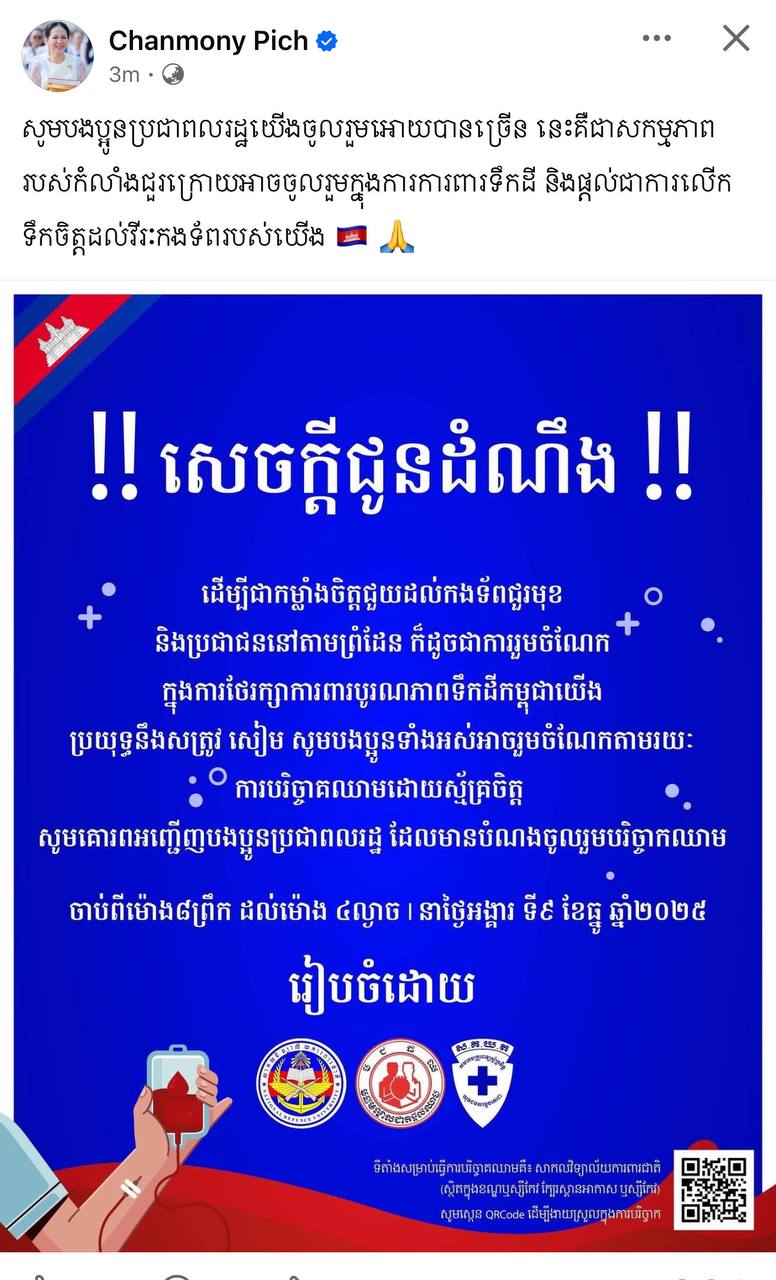លោកជំទាវ ពេជ ចន្ទមុន្នី ហ៊ុនម៉ាណែត៖ «សូមបងប្អូនប្រជាពលរដ្ឋយើងចូលរួមអោយបានច្រើន នេះគឺជាសកម្មភាពរបស់កម្លាំងជួរក្រោយអាចចូលរួមក្នុងការការពារទឹកដី និងផ្តល់ជាការលើកទឹកចិត្តដល់វីរកងទ័ពរបស់យើង» ៕