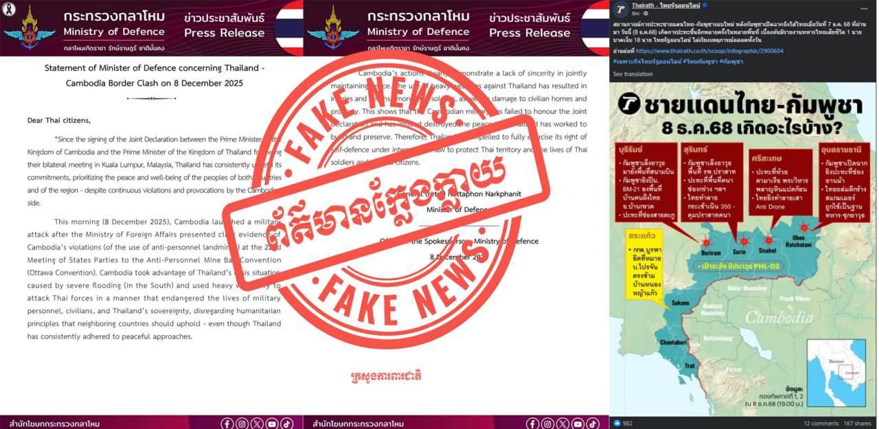 ការផ្សព្វផ្សាយរបស់ ការិយាល័យអ្នកនាំពាក្យក្រសួងការពារជាតិថៃ និងសារព័ត៌មាន Thairath ជាព័ត៌មានប្រាស់ចាកពីការពិតទាំងស្រុង កម្ពុជាមិនបានបើកការបាញ់ប្រហារ និងមកដល់វេលានេះកម្ពុជាមិនបានតបតនោះទេ។
