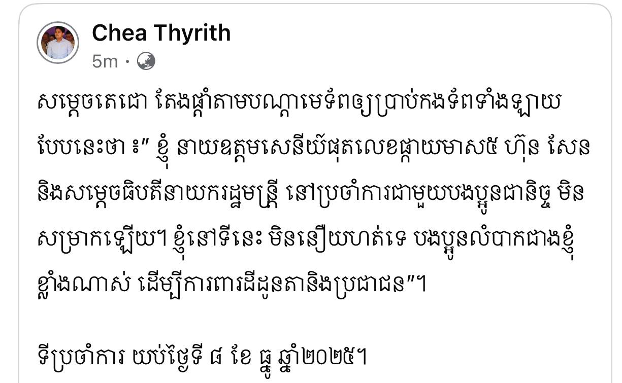 សម្តេចតេជោ ហ៊ុន សែន តែងផ្តាំតាមបណ្តាមេទ័ពឲ្យប្រាប់កងទ័ពទាំងឡាយបែបនេះថា៖ «ខ្ញុំនាយឧត្តមសេនីយ៍ផុតលេខផ្កាយមាស៥ ហ៊ុន សែន និងសម្តេចធិបតីនាយករដ្ឋមន្រ្តី នៅប្រចាំការជាមួយបងប្អូនជានិច្ច មិនសម្រាកឡើយ។ ខ្ញុំនៅទីនេះមិននឿយហត់ទេ បងប្អូនលំបាកជាងខ្ញុំខ្លាំងណាស់ ដើម្បីការពារដីដូនតានិងប្រជាជន»។