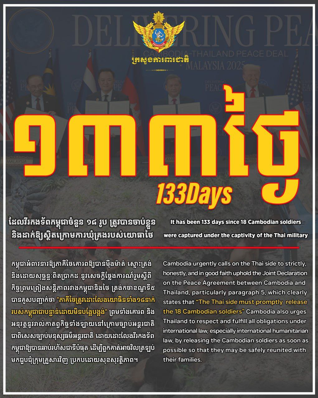 កម្ពុជាអំពាវនាវឱ្យភាគីថៃគោរពឱ្យបានម៉ឺងម៉ាត់ ស្មោះត្រង់ និងដោយសុច្ឆន្ទៈពិតប្រាកដ នូវសេចក្តីថ្លែងការណ៍រួមស្តីពីកិច្ចព្រមព្រៀងសន្តិភាពរវាងកម្ពុជានិងថៃ ត្រង់កថាខណ្ឌទី៥ បានគូសបញ្ជាក់ថា “ភាគីថៃត្រូវដោះលែងយោធិនទាំង១៨នាក់របស់កម្ពុជាជាបន្ទាន់ដោយមិនបង្អែបង្អង់” ព្រមទាំងគោរពនិងអនុវត្តនូវរាល់កាតព្វកិច្ចទាំងឡាយនៅក្រោមច្បាប់អន្តរជាតិ ជាពិសេសច្បាប់មនុស្សធម៌អន្តរជាតិ ដោយដោះលែងវីរកងទ័ពកម្ពុជាឱ្យបានឆាប់រហ័សជាទីបំផុត ដើម្បីពួកគាត់អាចវិលត្រឡប់មកជួបជុំក្រុមគ្រួសារវិញ ប្រកបដោយសុខសុវត្ថិភាព។