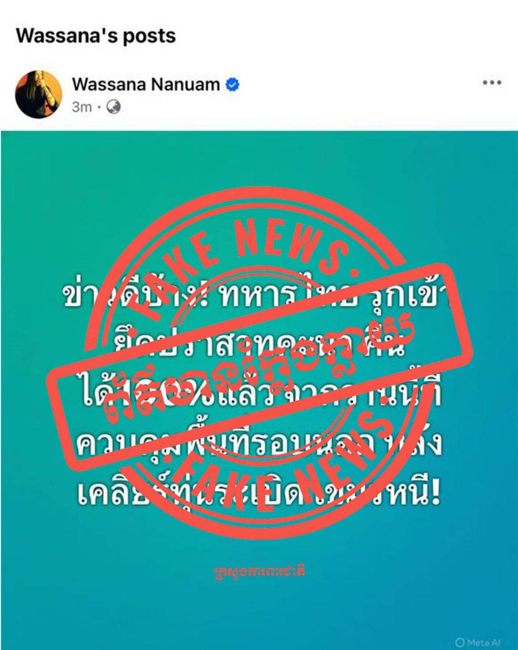 ការផ្សព្វផ្សាយរបស់ អ្នកការសែតកងទ័ពថៃឈ្មោះ Wassana’s Nanuam ដែលថាទាហានថៃវាយលុកដណ្តើមយកប្រាសាទខ្នារ មកវិញបានមកវិញ១០០ភាគរយ គឺជាព័ត៌មានក្លែងក្លាយ។