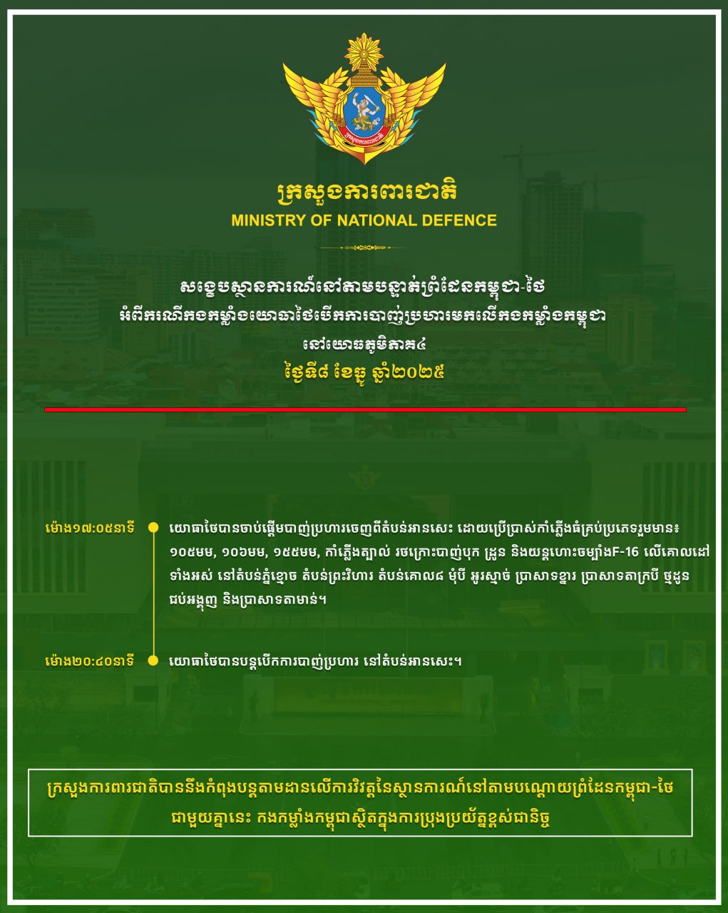 សង្ខេបស្ថានការណ៍នៅតាមបន្ទាត់ព្រំដែនកម្ពុជា-ថៃ អំពី ករណីកងកម្លាំងយោធាថៃបើកការបាញ់ប្រហារមកលើកងកម្លាំងរបស់កម្ពុជា នៅយោធភូមិភាគទី៤ នាថ្ងៃទី៨ ខែធ្នូ ឆ្នាំ២០២៥