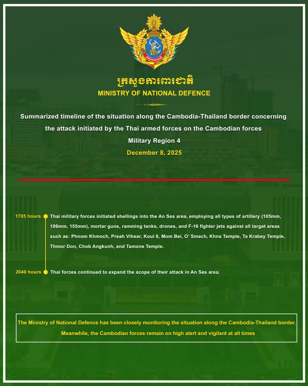 Summarized timeline of the situation along the Cambodia-Thailand border concerning the attack initiated by the Thai military forces on the Cambodian forces at Military Region 5 on December 8, 2025: