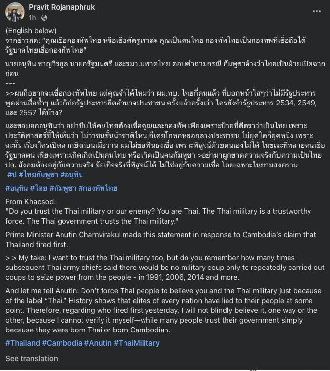 លោកបានសង្កត់ធ្ងន់ៗទៅកាន់នាយករដ្ឋមន្ត្រីថៃថា «ខ្ញុំសូមប្រាប់លោក Anutin ថា កុំបង្ខំប្រជាជនថៃឱ្យជឿអ្នក និងកងទ័ពថៃ គ្រាន់តែដោយសារតែពាក្យថា [ជាជនជាតិថៃ]»៕