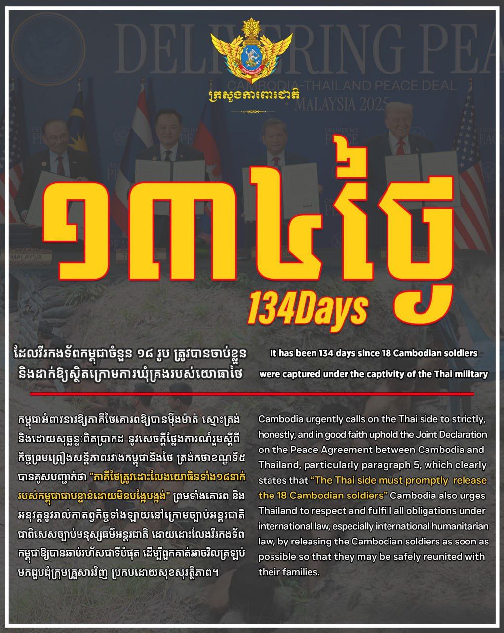 កម្ពុជាអំពាវនាវឱ្យភាគីថៃគោរពឱ្យបានម៉ឺងម៉ាត់ ស្មោះត្រង់ និងដោយសុច្ឆន្ទៈពិតប្រាកដ នូវសេចក្តីថ្លែងការណ៍រួមស្តីពីកិច្ចព្រមព្រៀងសន្តិភាពរវាងកម្ពុជានិងថៃ ត្រង់កថាខណ្ឌទី៥ បានគូសបញ្ជាក់ថា “ភាគីថៃត្រូវដោះលែងយោធិនទាំង១៨នាក់របស់កម្ពុជាជាបន្ទាន់ដោយមិនបង្អែបង្អង់” ព្រមទាំងគោរពនិងអនុវត្តនូវរាល់កាតព្វកិច្ចទាំងឡាយនៅក្រោមច្បាប់អន្តរជាតិ ជាពិសេសច្បាប់មនុស្សធម៌អន្តរជាតិ ដោយដោះលែងវីរកងទ័ពកម្ពុជាឱ្យបានឆាប់រហ័សជាទីបំផុត ដើម្បីពួកគាត់អាចវិលត្រឡប់មកជួបជុំក្រុមគ្រួសារវិញ ប្រកបដោយសុខសុវត្ថិភាព។